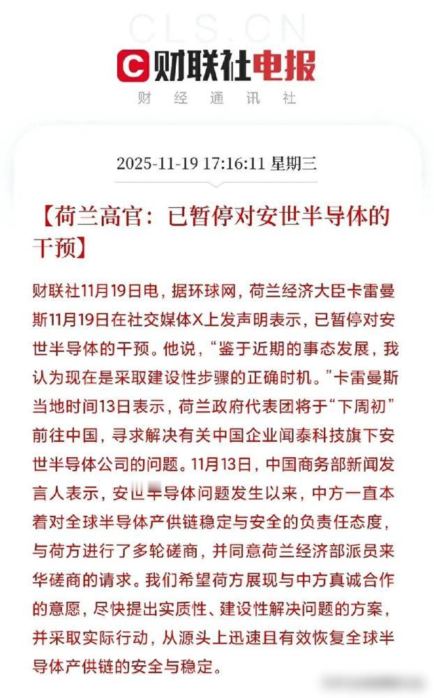 重大好消息!突发重磅利好!荷兰正式宣布,暂停对安世半导体干预。 这事儿我盯了好几个月了,之前荷兰那边说要干预安世半导体,可把人急坏了。安世是全球汽车功率半导体的核心供应商,咱们新能源车、工业控制这些领域的芯片供应,可太依赖它了。现在荷兰经济大臣直接发声明暂停干预,相当于给供应链吃了颗“定心丸”——汽车芯片的稳定供应有保障了,下游车企和零部件厂估计能松口气。 最直接受益的肯定是闻泰科技。作为安世的母公司,之前这事儿压得股价都有点喘不过气,现在危机解除,估值修复是板上钉钉的事儿。我认识几个炒半导体的朋友,昨天听到消息都在说“闻泰要回血了”。 往大了看,这不仅是单个企业的利好。半导体这行讲究全球协作,荷兰松口说明合作还是主流。国内半导体设备企业,像中微、北方华创这些,以后和国际伙伴的技术交流肯定更顺,成熟制程的设备说不定能接更多单子。 最近新能源车和AI这么火,半导体需求本来就在往上蹿。这时候供应链稳了,相当于给行业加了把火。我个人更看好汽车芯片这条线——车越智能,用的功率半导体越多,安世这一稳,下游跟着受益的企业可不少。 总的来说,这是个积极信号,全球半导体产业链又往“合作共赢”迈了一步。咱们国内企业抓住机会,把技术和产能都提上去,未来肯定更有看头。 MCN双量进阶计划