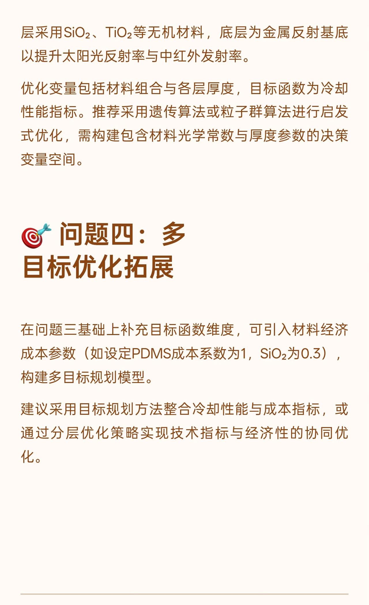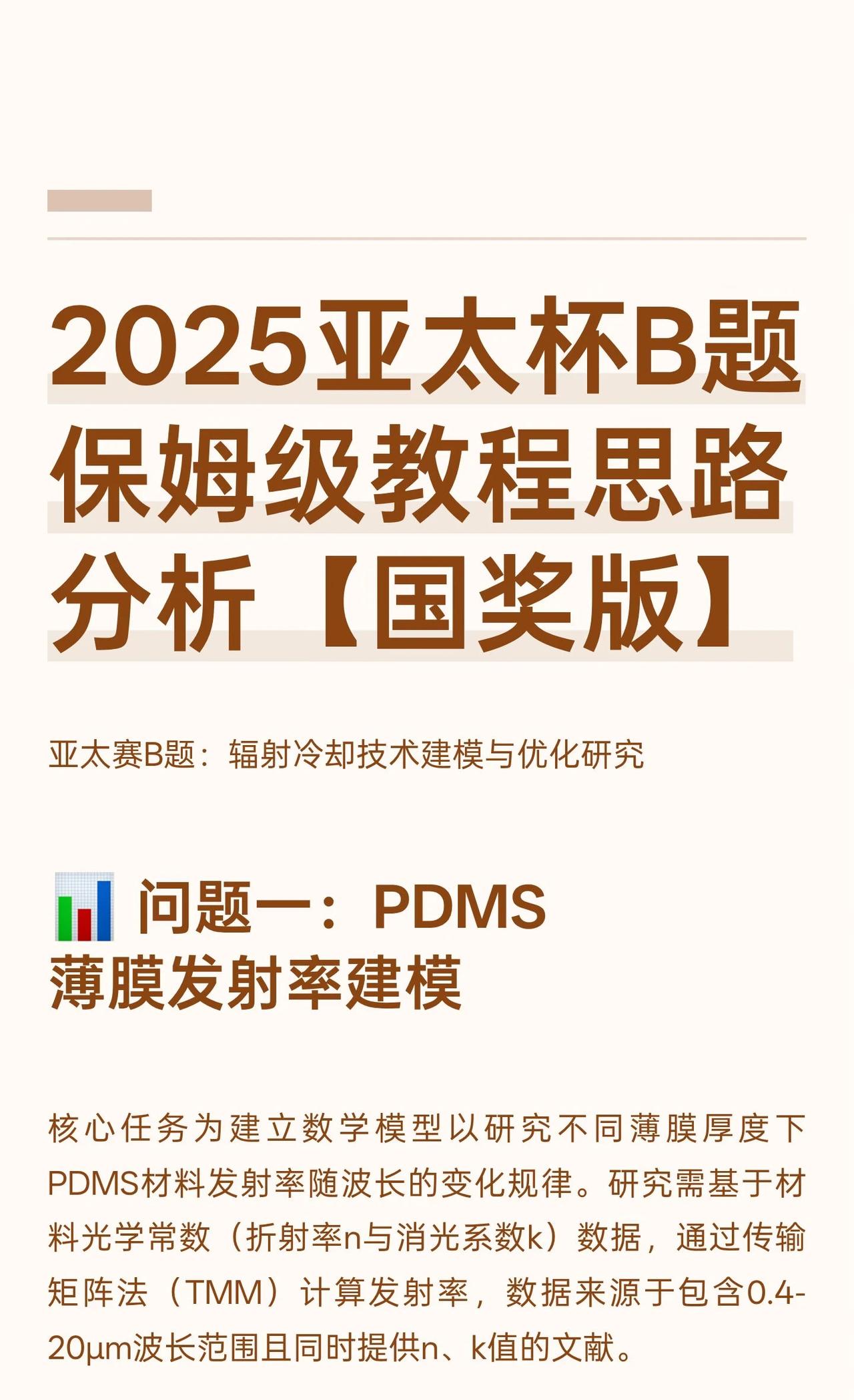 2025亚太杯B题保姆级教程思路分析【国奖版】 研究辐射冷却技术,通过TMM计算PDMS薄膜发射率,分析不同厚度下的冷却性能,优化多层膜结构设计,引入成本约束,实现冷却性能与经济性的协同优化。 数学建模竞赛 2025亚太杯 2025亚太杯b题 2025亚太赛