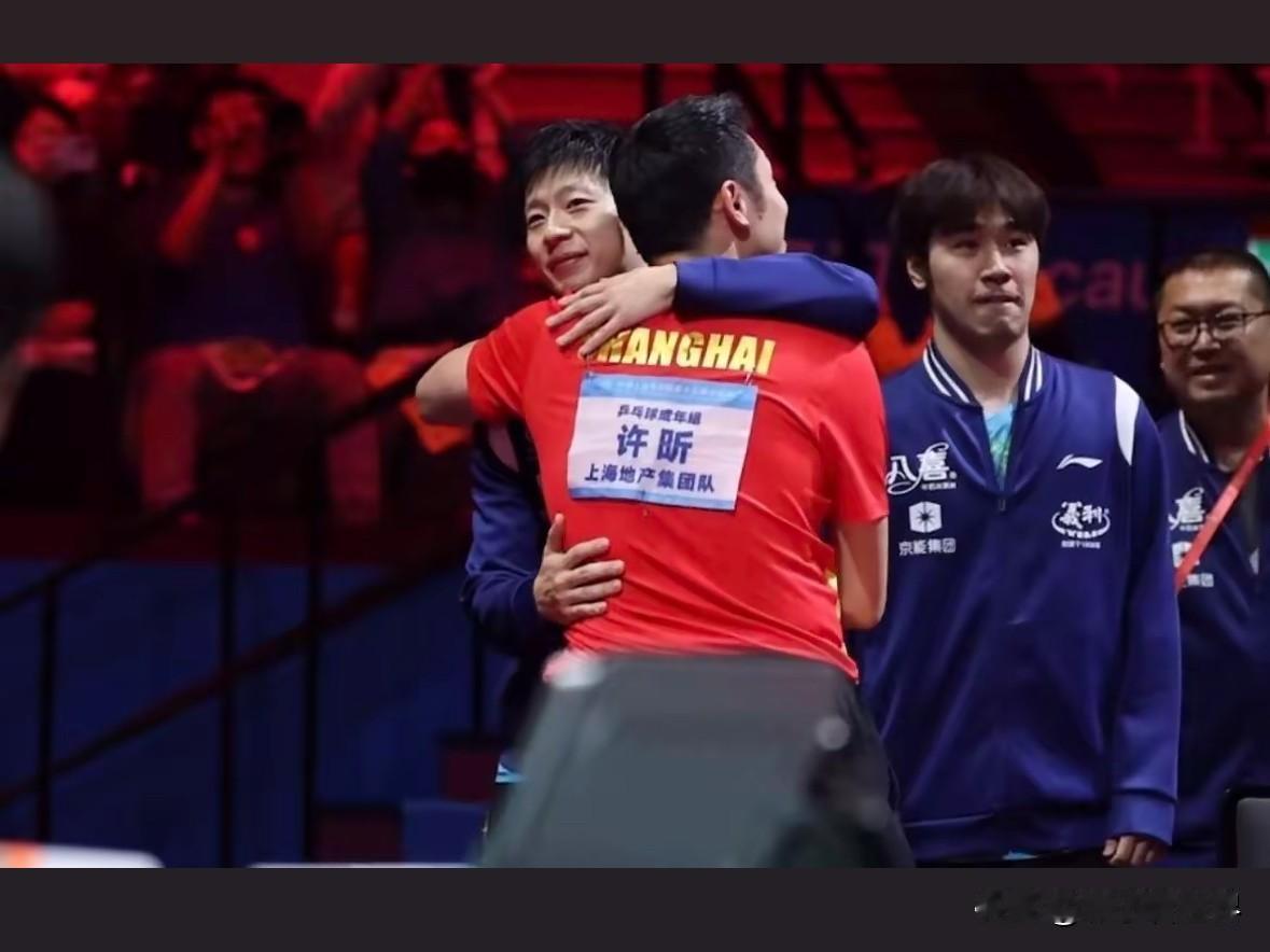 马龙赛后拥抱许昕樊振东 这两张照片太有意思了。瞧瞧许昕,让人不禁感慨廉颇老矣,青春不再。 他们亦友亦敌,相伴争斗了一辈子,满眼皆是回忆。转头再看有樊振东这样年轻的后辈,一种由衷的喜悦油然而生。 马龙看向许昕时,感觉眼里泛着泪花;望向樊振东时,又带着些许安慰与开心。 或许这便是龙队对小胖的期望与爱吧。