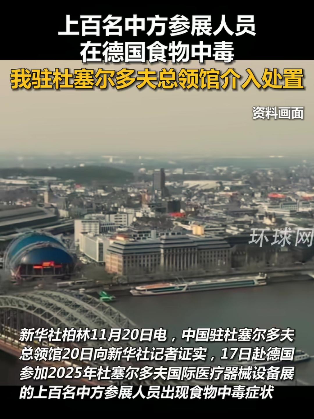 中国赴德国参展的上百位参展人员食物中毒!我国驻杜塞尔多夫总领馆已介入处置! 经过中国驻杜塞尔多夫总领馆的证实,11月17日赴德国杜塞尔多夫国际医疗器械展的上百位中方参展人员出现了食物中毒的情况,据了解是当地一家中餐馆提供的餐食有问题,至少有4人住院治疗。 德国会出现食品安全问题,这确实颠覆了国内人的想象,在我们的印象中,德国干事情都是非常严谨的,德国的各项法律法规也是相当的健全的。 各位是怎么看的?欢迎评论区留言。