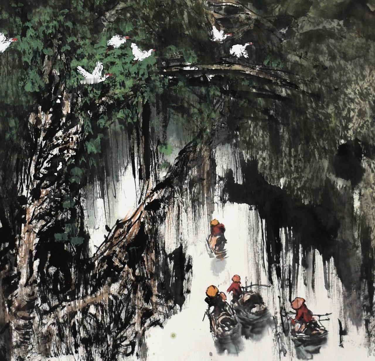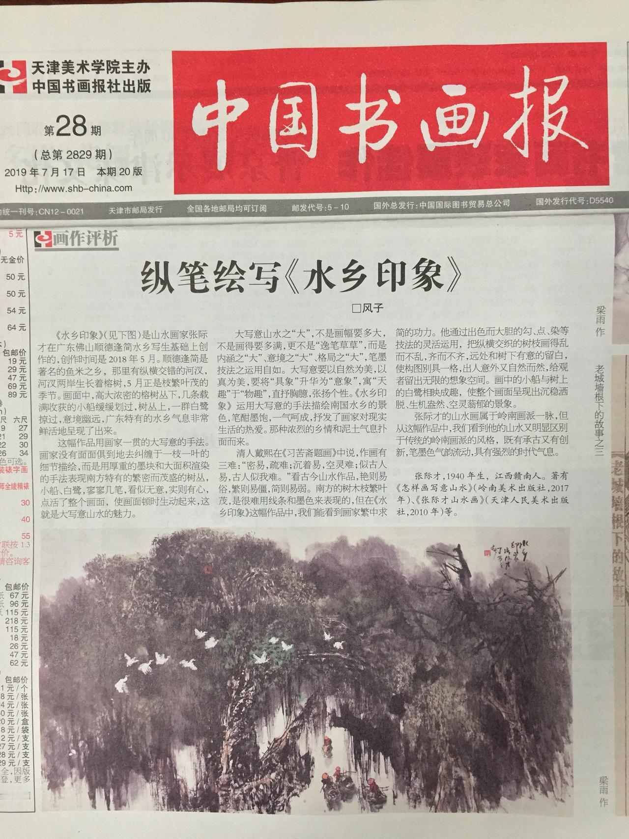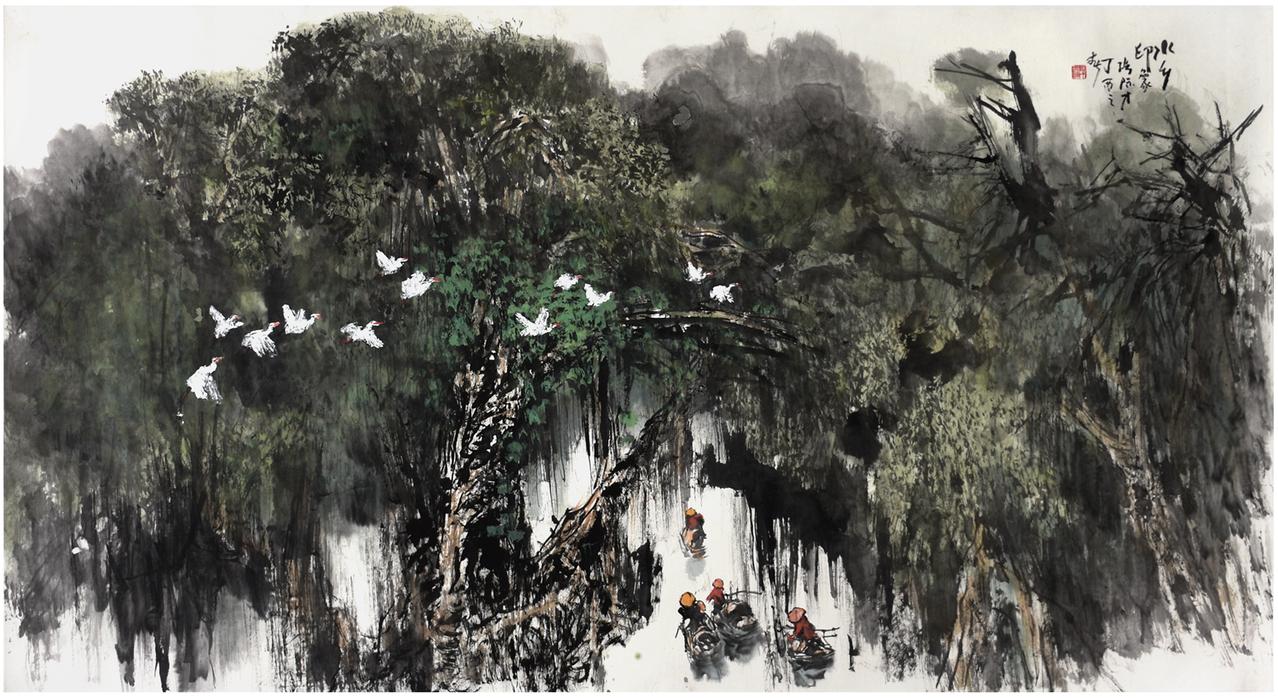 作品赏析:张际才《水乡印象》。 《水乡印象》是张际才2018年创作的国画山水,规格为:97cmx180cm。该作品以广东顺德逢简水乡为素材,在写生的基础上,以当代写意的手法进行了再创作。在画面的处理上,画家没有过多纠缠于一枝一叶等细节的描绘,而是通过“繁中求简”的原则,通过流畅有力的线条、厚重的墨块和以色破墨的渲染,将岭南水乡榕树“一树成林”的繁茂、生机勃勃表现得淋漓尽致。在点景上,他以寥寥几笔勾勒出小船和白鹭的形态,这些看似随意的布局,使画面立即生动起来,充满了生活气息。画家在作品中寓“天趣”于“物趣”,通过对自然景物的写意,传达出一种超脱于物象之外的诗意和趣味。大笔挥洒,直抒胸臆,将自己的情感和个性淋漓尽致地表达在画面上,非常有“张氏风格”。 《水乡印象》可以说是张际才近几年的代表作之一,展现了他对传统山水的深刻理解与传承,并以以当代审美视角和现代笔墨对国画山水进行了一次有益的探索,为我们提供了一个理解和欣赏当代中国山水画的重要范本。 该作品曾以《纵笔绘写水乡印象》为题发表在《中国书画报》2019年第28期上。 文/庄鲁