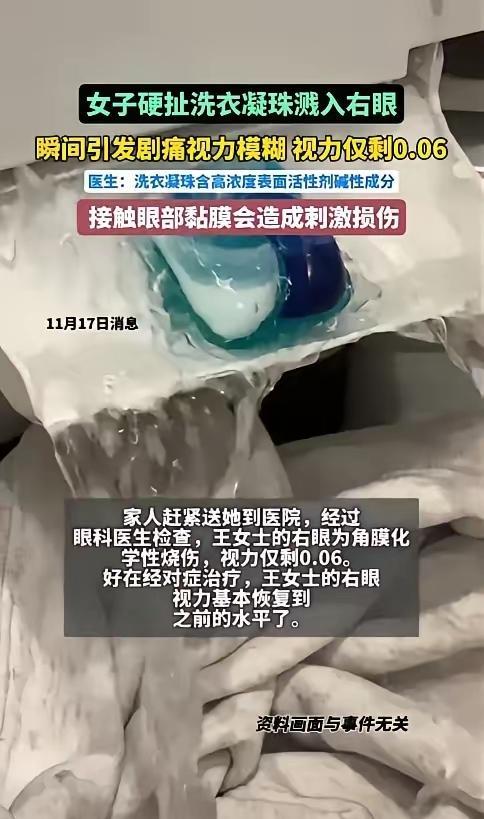 “悲剧还是发生了!”浙江杭州,一女子洗衣服时,发现洗衣凝珠黏在了一起,她用力撕扯时,凝珠发生了爆炸,大量洗涤剂溅入眼睛!女子瞬间看不清东西,而且眼睛传来剧烈的疼痛,送往医院检查,发现视力仅剩0.06。网友:还是洗衣粉安全! 你说现在这家务活儿,真是处处都得小心。那天杭州这位女士看见凝珠粘一块儿,顺手一扯,谁能想到会炸开呢?眼睛当时就火烧火燎的疼,眼前白茫茫一片,家里人吓得赶紧往医院送。 检查结果出来,视力只剩0.06,这个数字可能大家没概念。这么说吧,视力表最上面那个大字都看不清,走路都得靠人扶。医生说是化学烧伤,角膜损伤严重,再严重点可能就永久性失明了。 这事儿真不是个例。去年江苏有个三岁娃,把凝珠当糖果咬,满嘴起泡送急诊。上海六院也接过好几个类似病例,都是凝珠液体进眼睛,轻则红肿流泪,重则视力下降。 那些彩色凝珠看着可爱,其实碱性特别强。中国洗协有个数据,一颗凝珠的洗涤剂浓度是普通洗衣液的五六倍。这要进了眼睛,可比洗衣液危险多了。 存放真是个大问题。夏天阳台温度能到四五十度,凝珠外膜一软就粘一块。有人想着放冰箱,结果更糟,温差一大反而更容易破。最好就是放在阴凉抽屉里,别囤太多。 真要溅到眼睛里,记住医生教的:马上找水龙头,掰开眼皮冲十五分钟。得转动眼球冲,千万别揉。有人觉得冲一会儿就行,那不行,化学剂残留更麻烦。 现在家家都图方便,可方便背后藏着风险。洗衣粉确实没这么危险,就是用量不好控制。凝珠用着顺手,安全意识更不能少。 这位女士后来视力慢慢恢复了,但那种后怕一直都在。她说现在洗衣服都戴眼镜,看见凝珠心里就发怵。谁家洗衣服不是图个省事,可安全这事儿,真不能图省事。 生活里这些安全隐患,说大不大说小不小。多留个心眼,看说明书,按规范用,很多意外都能避免。你说是不是这个理?