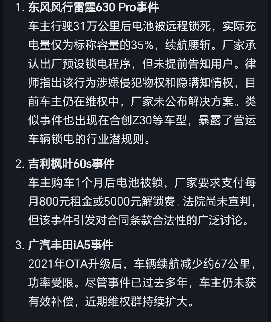一个女孩买了一辆电车,在高速路上120码的车速行驶的中途,提示10秒钟内要给电池断电,当时前面没有加油站和服务区的情况下.还好没出问题,否则后果都不敢想,去找卖车的理论:对方说,车是你自己买的,但里面的电池你没有买,电池里面的技术你们也没有买,车和电池不能混为一谈。那买车不买电池的吗?那还买啥车?不是不买国产电车,这不是自家人坑自己人吗?我全款买的车,但车感觉又不是我的,买车的时候毕恭毕敬,买完后直接翻脸不认人。说锁电就锁电,根本不管你当时在什么路况。还是买油车靠谱,至少不会锁电,锁系统。 电车电池热失控