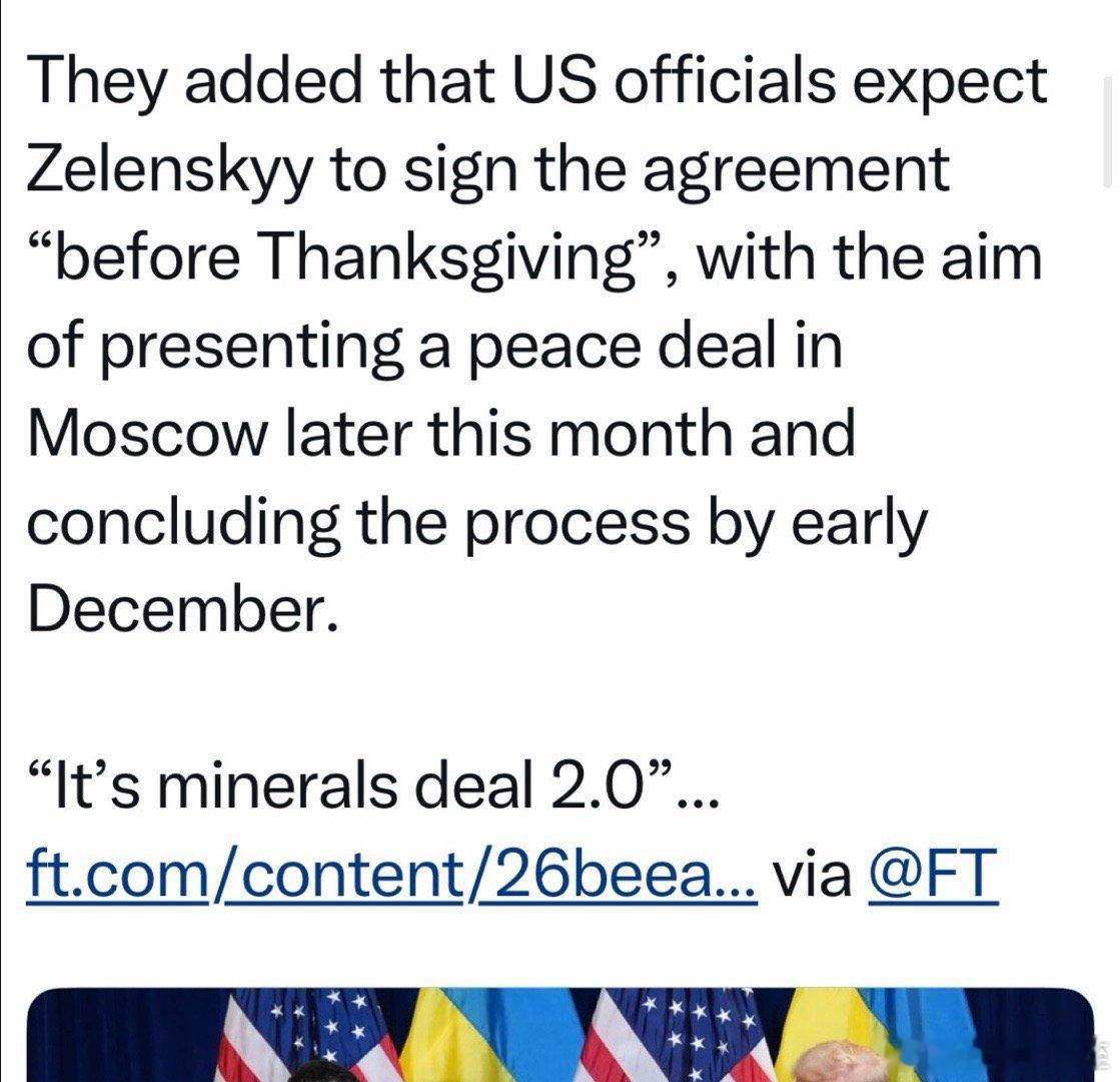 Financial Times援引乌克兰官员:美国正施加巨大压力,逼迫乌克兰接受最新版“和平方案”白宫希望Zelensky“感恩节前签字”(下周四),以便十一月底能交给俄,然后十二月初达成协议,实现“年内停战”的目标