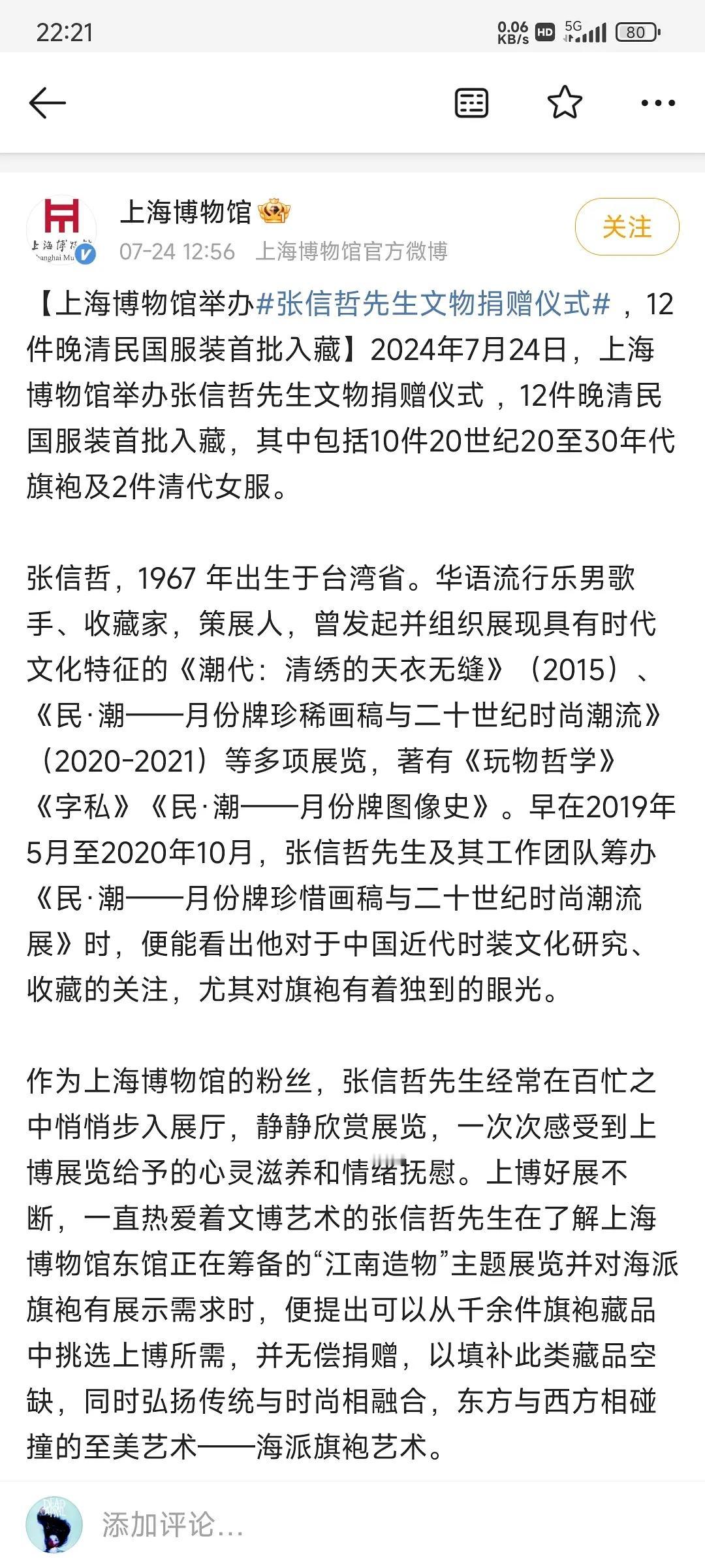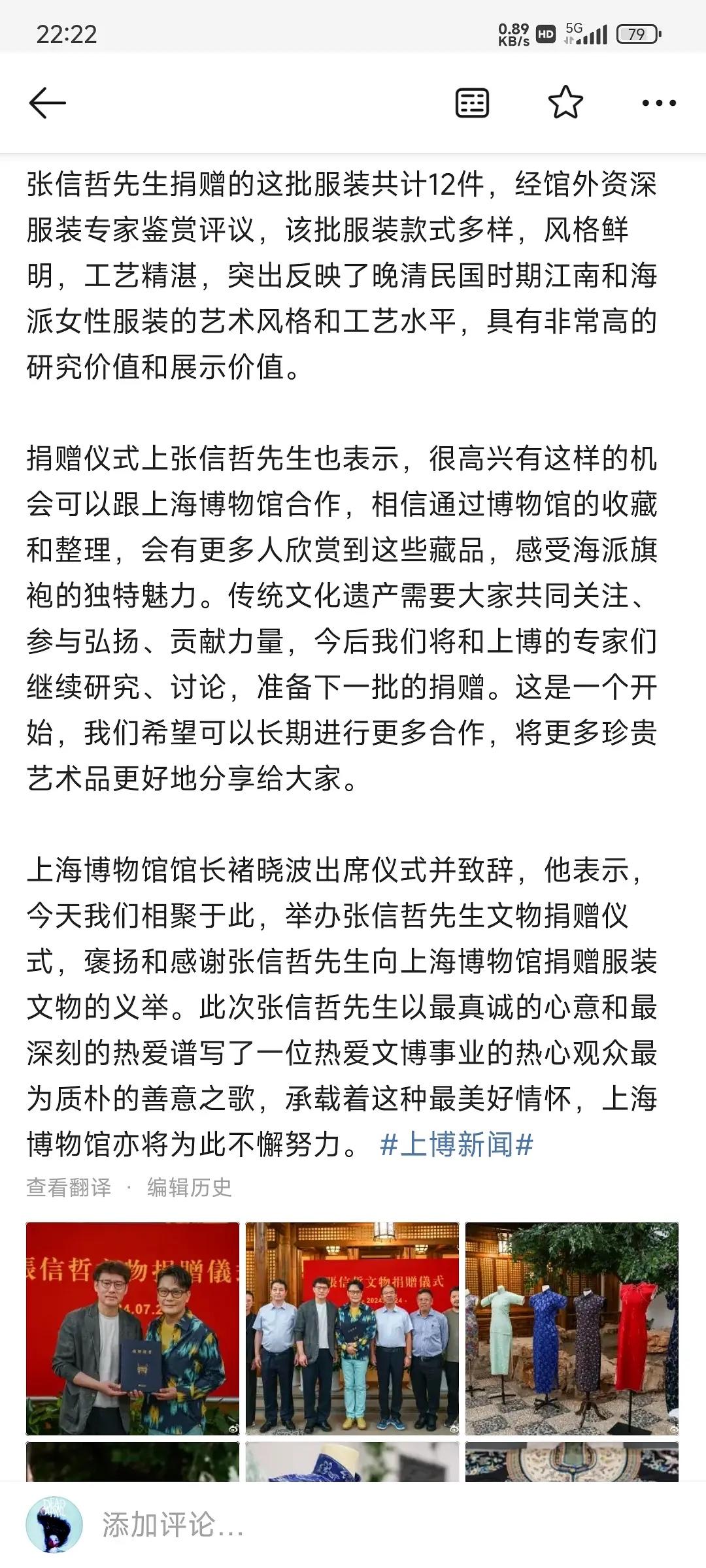 才知道歌手张信哲是地道的古董爱好者,曾给上海博物馆捐赠过12件晚期民国服装,每一件都华丽精致,其中有10件是旗袍。 据说张信哲收藏的旗袍多达上千件,价值起码上亿,其他收藏的还有明清的家具和龙袍,之前武汉博物馆,上海震旦博物馆都展览过他的收藏。