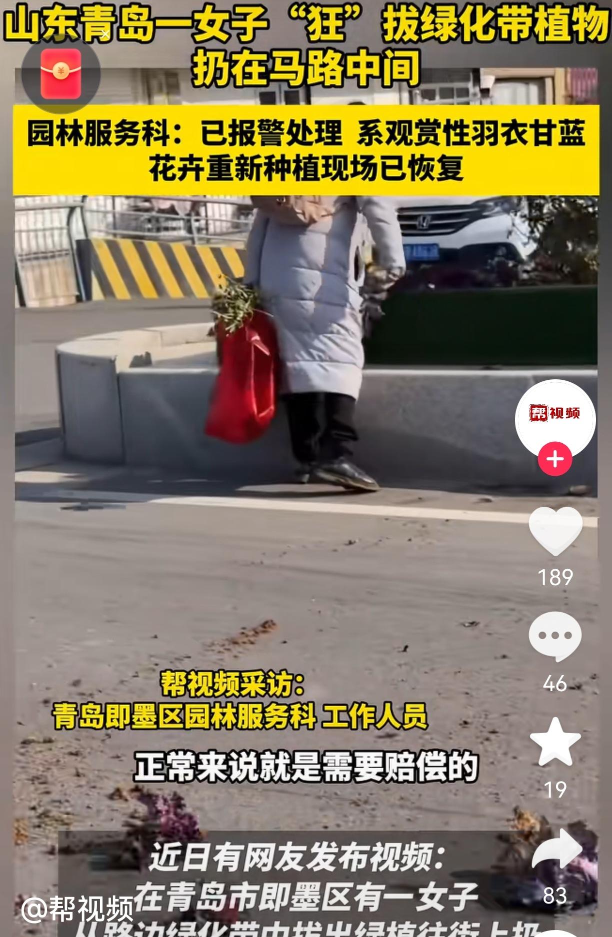 目击者说,今儿路过墨城路龙泉河桥,瞅见个穿羽绒服背粉书包的女的,蹲绿化带里猛拔紫色植物,拔下来就扔马路上,地上堆了老大一堆,看着真让人心疼。 那是绿化用的羽衣甘蓝,又不是她家种的。官方反应挺快,市政园林说现场已经恢复了,执法部门正调查,要是故意破坏,得赔偿还得挨罚呢。 广德之前也有毁绿种菜的,城管上门一教育,当事人认了错,清了菜重新种草坪。这事儿和那一样,公共绿地是大家的,谁都不能随便糟践。 你说这公共环境靠啥?不就靠咱每个人自觉爱护吗?