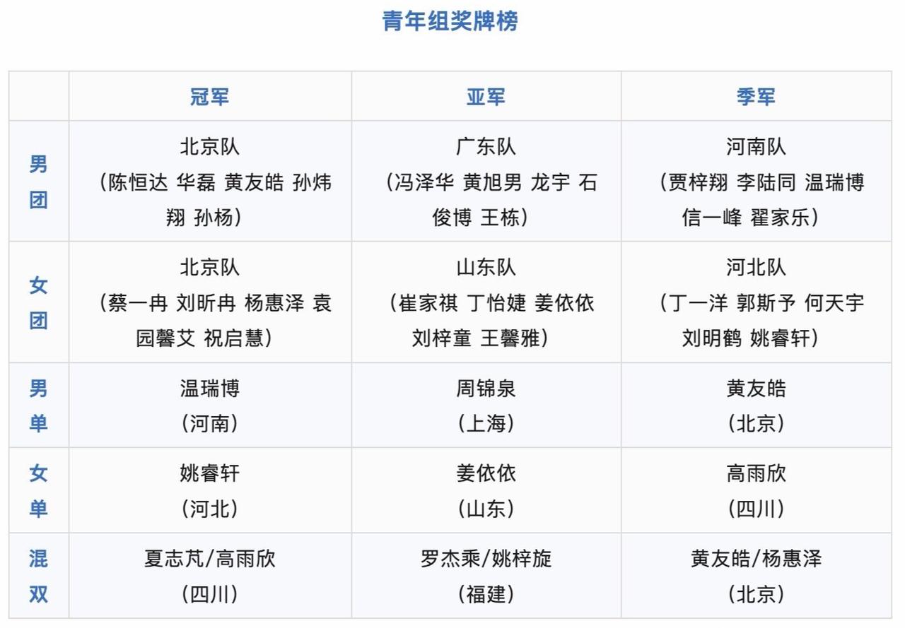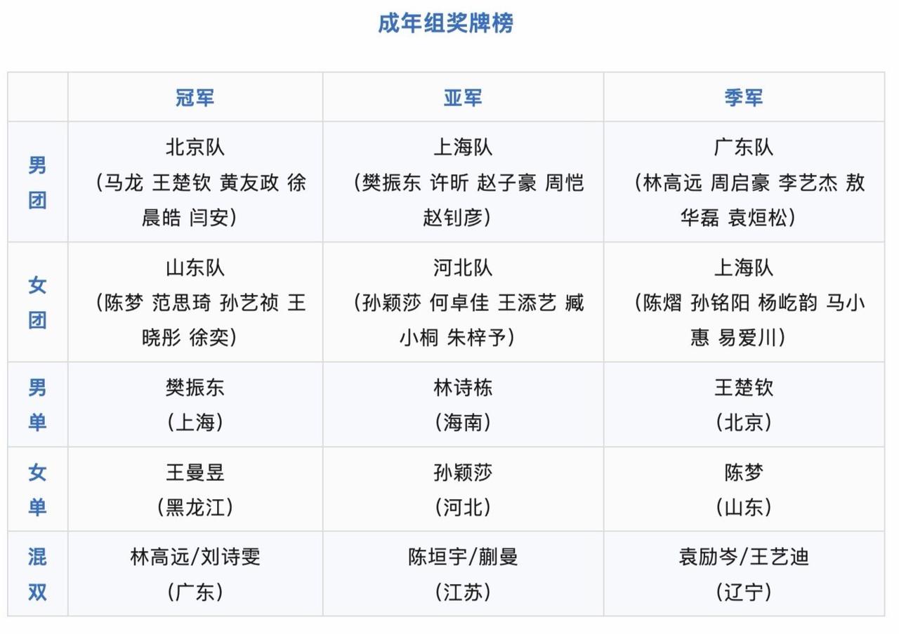 全运会乒乓球项目全部结束了,山东收获1金1银1铜,陈梦一人就拿到2奖牌 这是全运会所有乒乓球项目的奖牌榜,不难看出,北京队真的很强,拿下3枚金牌。 山东队也很出色,拿到1金1银和1铜。 在我看来,本届全运会,最大的赢家就是陈梦。31岁的人了,9个月不训练,回来就拿到2个奖牌,也算是前无古人了,至于说有没有后来者,谁都不知道。 最大的输家当属孙颖莎了,顶着世界第一的名号,却未能登顶,女单输了,女团还输了。 倒是王楚钦,喜忧参半吧,丢掉了男单金牌,拿到了男团金牌,东边不亮西边亮,有一个就可以了。 樊振东真是硬解之王,能把世界第一和世界第二都给掀翻,要知道,人家可是没有世界排名的。 当然,本届全运会最佳照片,就是陈梦这一张,她让你们小点声,她让你们闭嘴,她让你们无话可说。 这种感觉,真好! 用实力碾压一切牛鬼蛇神,陈梦做到了!陈梦乒乓球王楚钦回应头撞球桌全运舞台 港澳闪耀