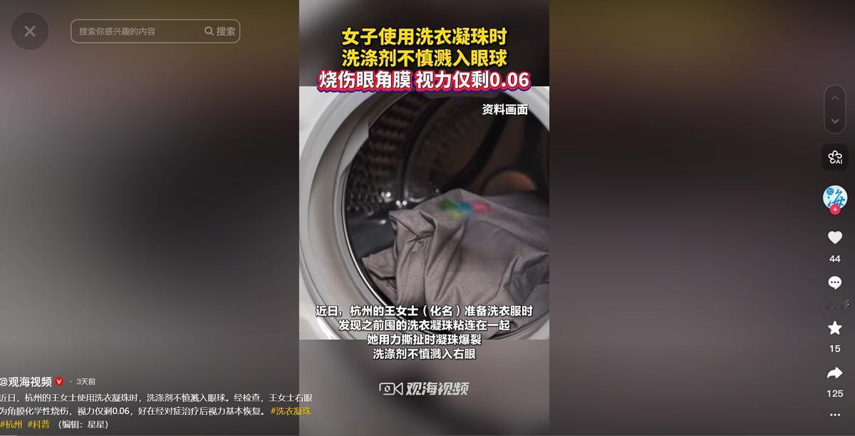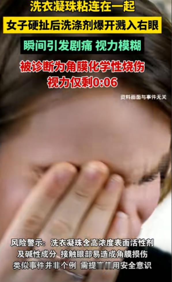 “悲剧还是发生了!”近日,浙江杭州,一女子洗衣服时,发现洗衣凝珠黏在了一起,她用力撕扯时,凝珠发生了爆炸,大量洗涤剂溅入眼睛!女子瞬间看不清东西,而且眼睛传来剧烈的疼痛,送往医院检查,发现视力仅剩0.06。网友:还是洗衣粉安全! 杭州的王女士就是受害者,那天她像往常一样准备洗衣服,打开存放洗衣凝珠的柜子,发现好几颗凝珠黏在了一起,紧紧地粘成一团,这种情况其实不少人都遇到过,大多觉得就是有点受潮粘住了,没当回事王女士也一样,想着顺手撕开来就能用,没多想就伸手去用力撕扯。 可就在她使劲的瞬间,意外发生了 黏在一起的凝珠突然 “砰” 地一声崩裂开来,就像小炸弹一样,包裹在里面的高浓度洗涤剂,瞬间像高压水枪似的喷射而出,径直溅进了她的右眼里。 那一瞬间王女士只觉得右眼剧痛难忍,像是有无数根小针在扎,眼泪不受控制地往下流,眼前一下子就模糊了,什么都看不清,她吓得魂都没了,家人也赶紧放下手里的事,火急火燎地把她往医院送,一路上她都捂着眼睛,疼得直冒冷汗,心里满是恐慌生怕眼睛就这么瞎了。 到了医院经过详细检查,医生给出的结果让一家人都揪紧了心,王女士的右眼角膜遭到了严重的化学烧伤,视力只剩下 0.06,这个数字说出来可能大家没概念,简单说就是几乎只能感觉到光影,连眼前的东西轮廓都看不清,更别说细节了。 好好的一个人,就因为撕了个洗衣凝珠,突然就陷入了看不清世界的恐惧里,这种打击谁都扛不住,虽然之后经过一段时间的专业治疗,王女士的视力基本恢复了,但那段惊魂的经历,还有角膜被烧伤的疼痛,估计这辈子都忘不了。 其实这事儿真不是偶然后来大家才弄明白,洗衣凝珠没咱们想的那么 “皮实”,反而特别 “娇气”,它外面那层薄膜遇水就溶,还特别怕热怕潮。 前段时间杭州气温回升,空气湿度也大,王女士家里的凝珠可能是储存环境不太对,高温高湿让薄膜变得不稳定,开始融化回潮,所以才会黏在一起。这种粘连其实是个警告信号,可咱们普通人根本不知道,只当是小问题,随手就想撕开。 可凝珠里面装的是高浓度洗涤剂,密封得很严实,用力撕扯的时候,内部压力突然变大,薄膜承受不住就崩裂了,里面的洗涤剂自然就喷出来了。 而且这洗衣凝珠为了方便,把洗涤剂浓度做得特别高,腐蚀性比普通洗衣粉、洗衣液强多了,一旦溅到眼睛里,伤害远比洗发水进眼睛严重得多。 这事儿曝光后网上好多网友都炸了,纷纷留言说 “还是洗衣粉安全”。不少人都分享自己的经历,说之前也遇到过凝珠粘连的情况,也是用力撕,现在想想都后怕,还有人说洗衣粉虽然麻烦点,得自己倒、自己搓,但至少不会有爆炸溅眼的风险用着放心。 大家吐槽的同时也开始留意洗衣凝珠包装上的安全提示,这才发现很多厂家的提示都印得特别小,藏在包装袋的角落里,不仔细找根本看不见,上面写着 “避免高温潮湿储存”“禁止强力撕扯”,可平时大家买的时候,只看到商家宣传 “一颗搞定”“方便快捷”,谁会去留意那些小字提示啊?如果厂家能把这些安全提示做得醒目一点,或者在宣传的时候多提一句风险,可能就不会有这样的悲剧发生了。 以后再遇到凝珠粘连的情况,可千万别用蛮力撕了,哪怕浪费一颗扔掉,也比让眼睛受伤害强,储存的时候也得注意,要放在阴凉干燥的地方,别随便扔在阳台或者潮湿的卫生间里,毕竟便利是为了让生活更美好,而不是为了给安全埋隐患。 (信息来源:观海视频)