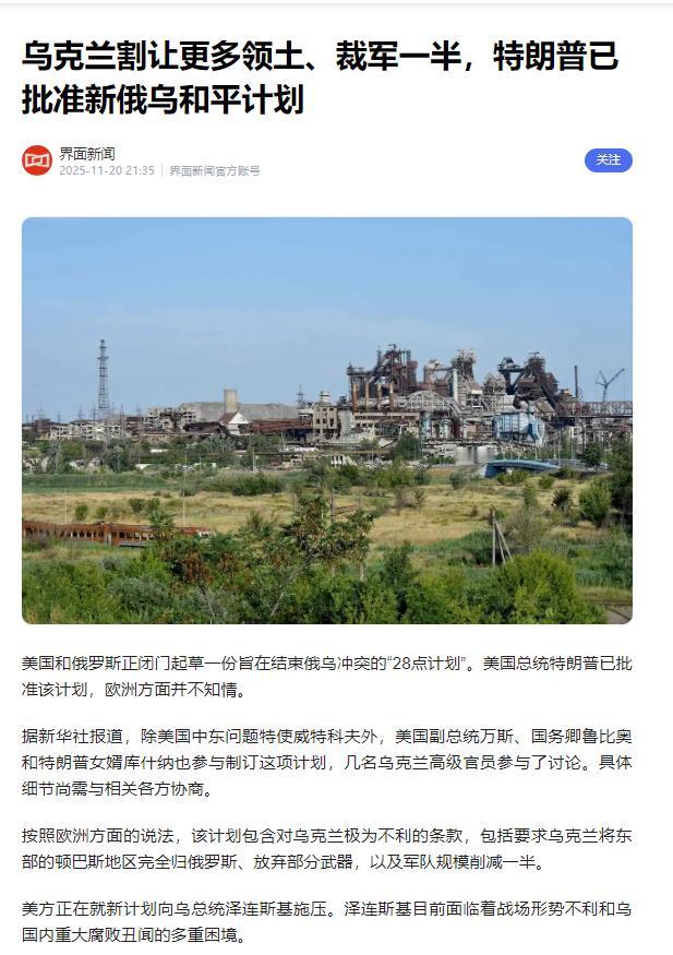 泽连斯基彻底出局?特朗普批准“俄乌和平协议”,乌克兰或成立临时政府与俄签约。 当地时间19日,美国NBC电视台援引白宫高级官员的话报道称,特朗普已经在本周早些时候批准了最新起草的“俄乌和平协议”,即美媒在早些时候披露的28点计划,包括乌克兰至少裁军一半、割让整个乌东地区等。 而乌克兰最高拉达议员斯科罗霍德则在接受采访时透露了一个惊人的消息:乌方可能将成立一个临时政府,由前乌军总司令扎卢日尼领导,负责与俄罗斯谈判、签署和平协议,并为之后的选举做准备。 评两句:这28点计划与其说是和平方案,不如说是美国给俄乌冲突划下的“止损线”——既保住了美国在东欧的影响力,又能把省下的钱用到国内选票上,一举两得。 就像3月美俄总统通话后,普京立马下令停止袭击乌能源设施,特朗普这边就推动停火,这种默契背后全是利益交换,之前美乌在白宫吵得脸红脖子粗,转头就达成共识,本质就是乌克兰认清了“谁才是真金主”。 再看协议里最扎眼的“裁军一半”,这可不是拍脑袋的要求。 乌军现在的现役兵力撑死了也就70来万,真要是一刀砍去一半,35万兵力没了,这对前线意味着什么?去年库尔斯克州的战斗里,乌军一次战斗就损失200多士兵,64次战斗才击退俄军9次进攻,这种消耗战本就靠兵力堆着。 可为啥乌克兰还可能接受?因为现在的乌军早就不是扎卢日尼当总司令时的样子了,当初他喊出“战场陷入僵局”被泽连斯基公开驳斥,俩人矛盾闹到全国皆知,军队指挥体系早有裂痕。 更重要的是,乌军的装备和补给全靠西方,美国要是借着裁军卡断援助,乌军连武器都拿不到,与其被耗死,不如主动裁军换和平,这笔账泽连斯基算得明白。 而且法国防长都直言“乌军的防御能力才是基辅的安全保障”,现在裁军看似削弱实力,实则是用收缩换生存。 割让整个乌东就更有说道了,这片土地早成了俄乌拉锯的“绞肉机”,从2022年打到现在,这里的工业设施毁了大半,可战略价值依旧金贵。 乌东是乌克兰的工业心脏,顿巴斯地区的煤炭、马里乌波尔的钢铁,曾撑起乌克兰30%的GDP,可现在这些地方早被俄军控制得七七八八。 3月19日俄军还在宣称“彻底击溃库尔斯克的乌军”,乌军则否认被包围,这种胶着状态下,乌东其实已经是“名义上的乌克兰领土,实际上的战场”。 与其接着赔人命,不如顺水推舟割让出去,还能换俄罗斯停火,对乌克兰来说算是“丢车保帅”。 更何况之前俄方就提过类似要求,现在美国出面调停,等于给了乌克兰一个台阶下,既不用承认战败,又能结束战火。 这时候扎卢日尼被推出来当临时政府首领,就太顺理成章了。 这位50岁的“铁将军”在乌克兰民众里的支持率一度超过90%,比泽连斯基的77%高出一大截,乌军士兵更是把他当父亲一样信赖。 之前他因为说真话被泽连斯基打压,反而让他赚足了民心——大家都觉得他是“敢说真话的军人”,不是只会喊口号的政客。 对比之下,泽连斯基从“民族英雄”变成现在的“谈判工具人”,民众早有不满。 俄罗斯那边对扎卢日尼也更认可,毕竟之前两军对垒时,扎卢日尼的指挥风格务实,不像泽连斯基那样硬撑,这种“能谈得拢”的特质正是现在需要的。 19日当天175名被俘乌军被释放,还有22名伤病员被俄方单方面放回,这种大规模换俘行动,很可能就是双方在为扎卢日尼上台后的谈判铺路。 乌方要成立临时政府,本质上是在给“卖国土、裁军队”找一个合理的借口。 有扎卢日尼这个“民族英雄”背书,民众对割地裁军的接受度会高很多——毕竟是大家信赖的将军做出的决定,总比政客偷偷摸摸签协议强。 而且临时政府的职责很明确:谈判、签协议、准备选举,等于把“背锅”的活儿全揽下来,等和平协议落地,选举结束,新政府上台,之前的争议就都翻篇了。 这种操作在国际政治里不算新鲜,找个有威望的人过渡,既能稳定局面,又能让核心利益者全身而退。 现在各方其实都在往这个方向使劲,美国推动协议是为了大选和省钱,俄罗斯拿到乌东和停火符合预期,乌克兰用土地和兵力换和平保住国家主体,扎卢日尼则借着这个机会完成从军人到政客的转型。 19日当天,俄乌还在互相指责对方袭击能源设施,俄军说乌军炸了自己的油库,乌军说俄军派了近150架无人机搞袭击,这种“边打边谈”的戏码看着热闹,实则是在为最终的和平协议争取筹码。 就像德国还在宣布扩大对乌援助,表面上是支持乌克兰,实则是在给美国递投名状,确保自己在战后的东欧格局里有一席之地。 至于那些被割让的土地和被裁掉的士兵,不过是这场大国游戏里,不得不付出的代价。 19日的这些消息,不是和平的开始,而是各方利益达成平衡的信号,接下来就看扎卢日尼怎么拿着这副牌,和俄罗斯好好谈谈了。