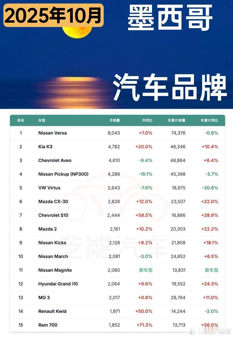 墨西哥 10 月车市表现挺亮眼,销量创下近九年同期新高,市场规模也是历史同期第二高。日产稳坐第一,丰田增速很猛,前六大品牌格局没怎么变。第二梯队竞争就激烈多了,福特大涨,现代有点下滑。中国品牌整体保持增长,长安和名爵是主要驱动力,长安增速尤其突出,名爵也稳居前十。不过品牌间表现不一,能看出在当地的基础还需要夯实。入门级三厢车、中高端皮卡需求都挺明朗,整体市场既有稳定底盘,新玩家和第二梯队的博弈也在加剧~