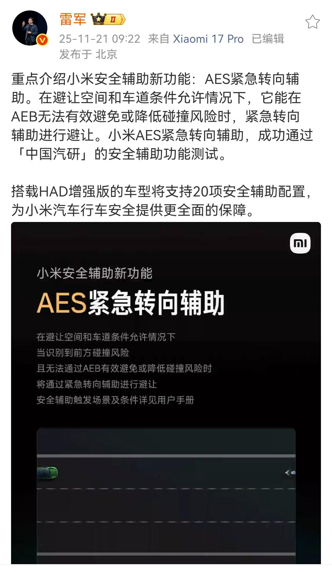 雷军:重点介绍小米安全辅助新功能,AES紧急转向辅助。在避让空间和车道条件允许情况下,它能在AEB无法有效避免或降低碰撞风险时,紧急转向辅助进行避让! 简而言之就是前面有障碍物,小米的车辆可以根据自主判断自主完成变道的操作,通过更换道路来降低发生事故的风险。 小米汽车目前已经发展到不单单使用一套安全措施来规避可能会发生的风险,车辆在紧急情况下会自主根据道路情况完成相应的操作,无需人工介入。 各位是怎么看的?欢迎评论区留言。