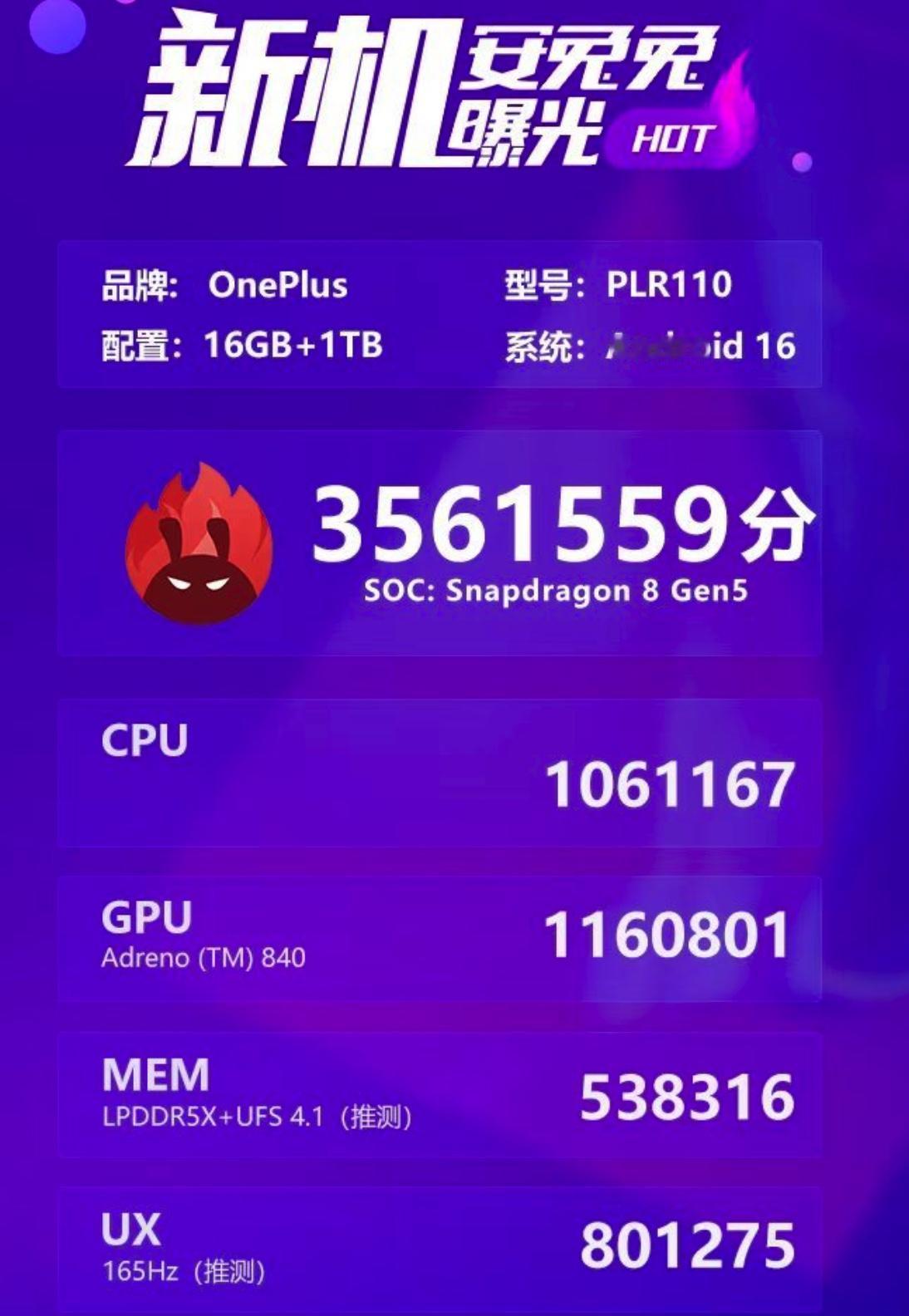 一加Ace 6T跑分曝光了,超过356万分,用的是骁龙8 Gen5处理器 单从跑分看的话,比第五代骁龙8至尊版手机跑分低不了多少