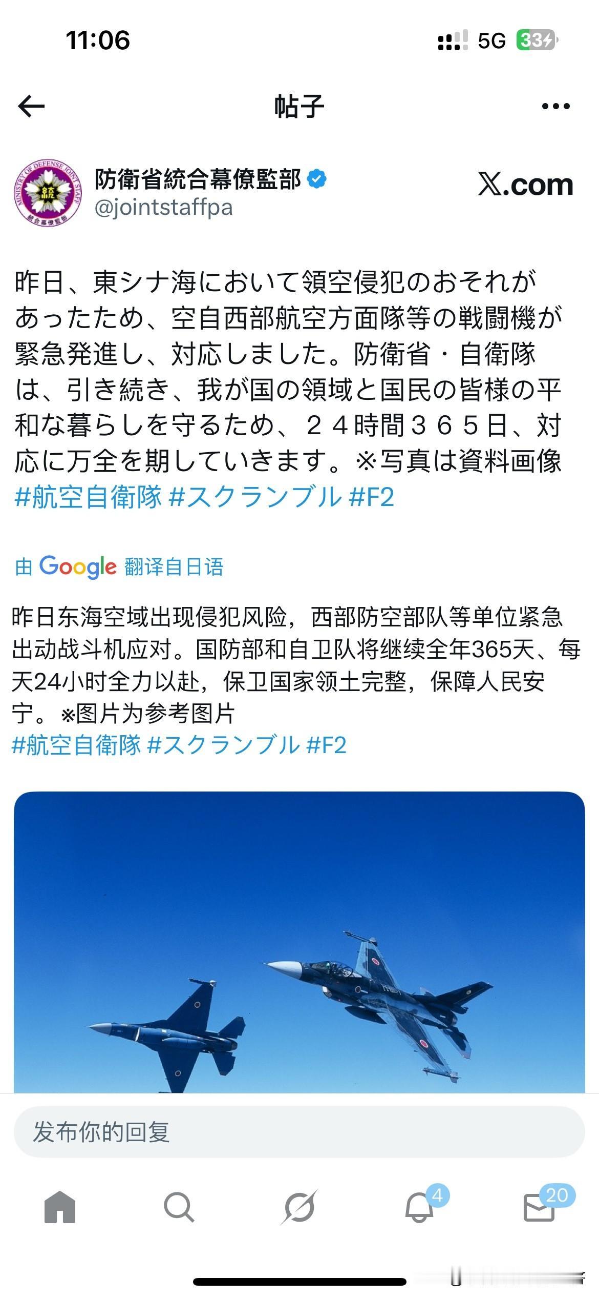11月21日,日本防空自卫队官方账号发文表示,昨天他们在东海空域出现侵犯领土的风险,紧急派往战斗机全程跟随监控。东海空域出现侵犯风险,西部防空部队等单位紧急出动战斗机应对。国防部和自卫队将继续全年365天、每天24小时全力以赴,保卫国家领土完整,保障安宁。