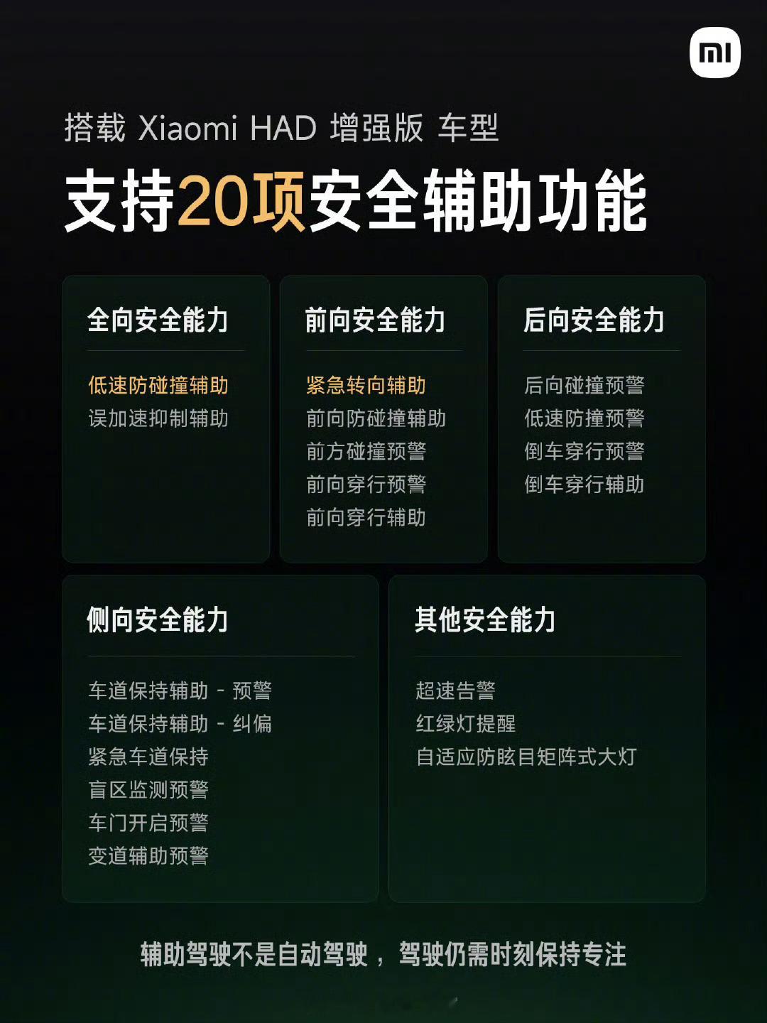 小米端到端辅助驾驶增强版发布。小米汽车介绍了小米安全辅助新功能「AES 紧急转向辅助」:在避让空间和车道条件允许情况下,它能在 AEB 无法有效避免或降低碰撞风险时,紧急转向辅助进行避让。小米 AES 紧急转向辅助,成功通过「中国汽研」的安全辅助功能测试。完成新版本升级后,搭载 Xiaomi HAD 增强版的车型支持 20 项安全辅助配置,为行车安全提供更全面的保障。