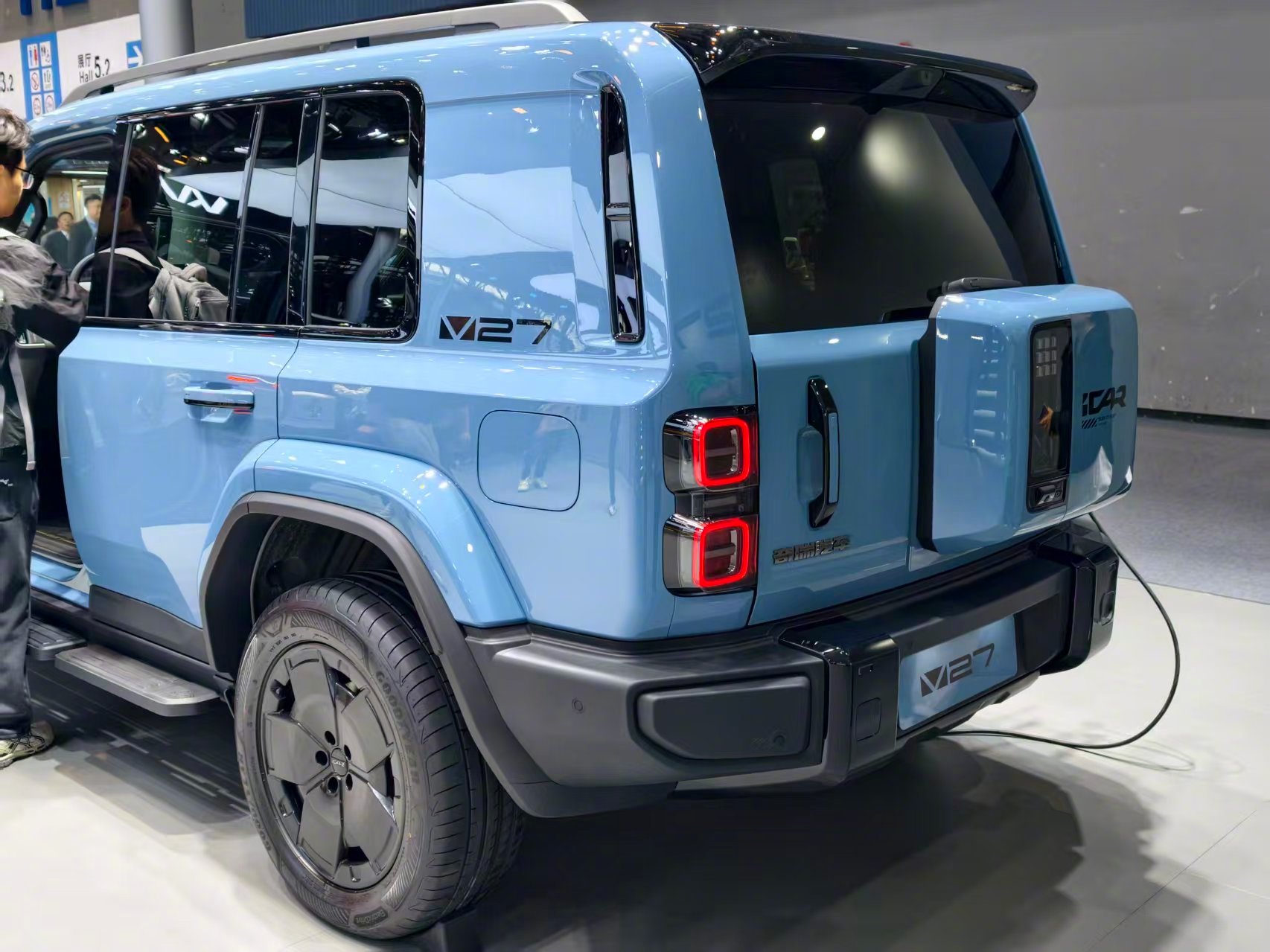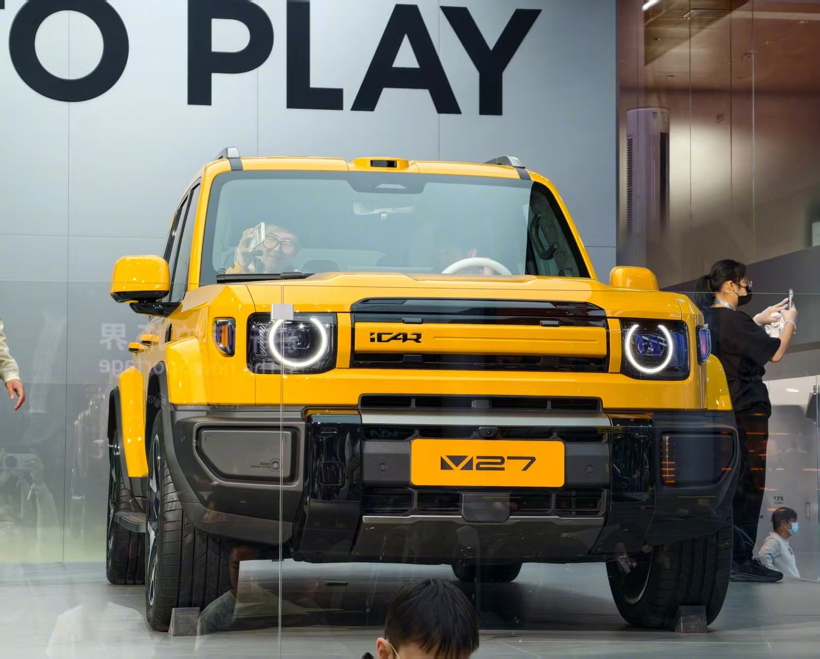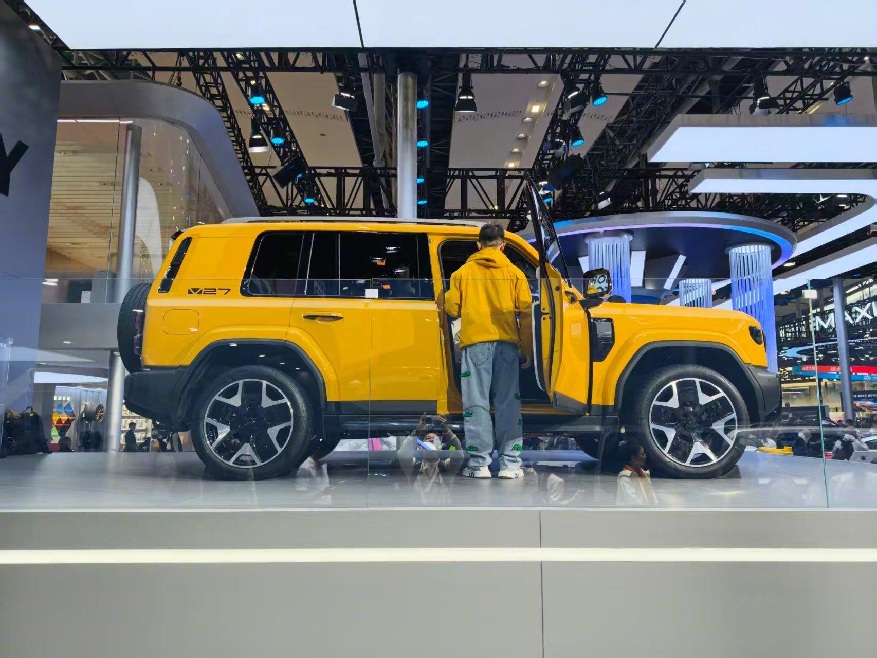 在广州车展现场,这个 iCAR V27 的展台真不错,这台 iCAR V27 方盒子造型,视野直观、辨识度极高。车身裸色涂装搭配粗犷黑色轮拱,辅以丰富个性车色选择,展现出强烈的年轻化与硬派气质。