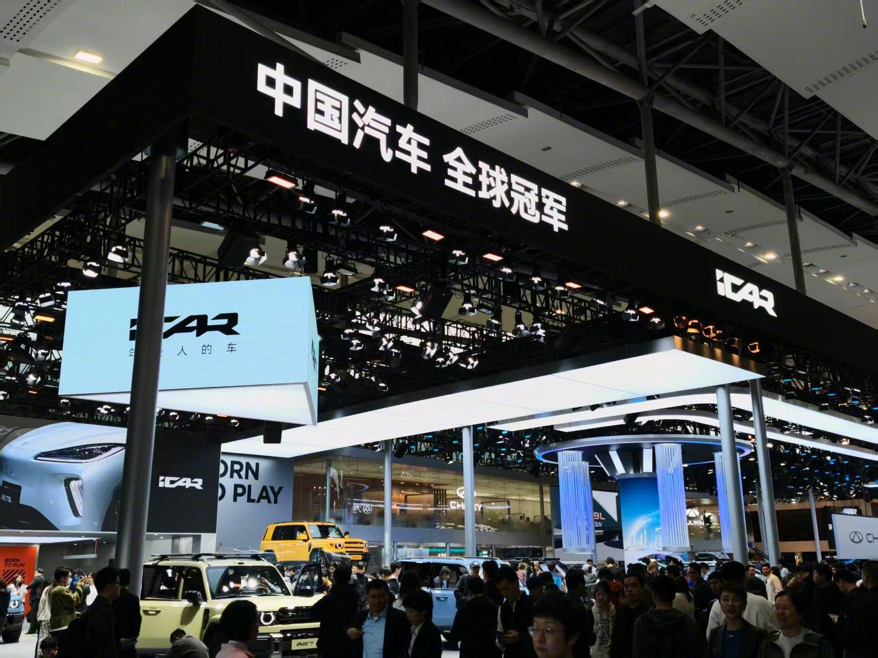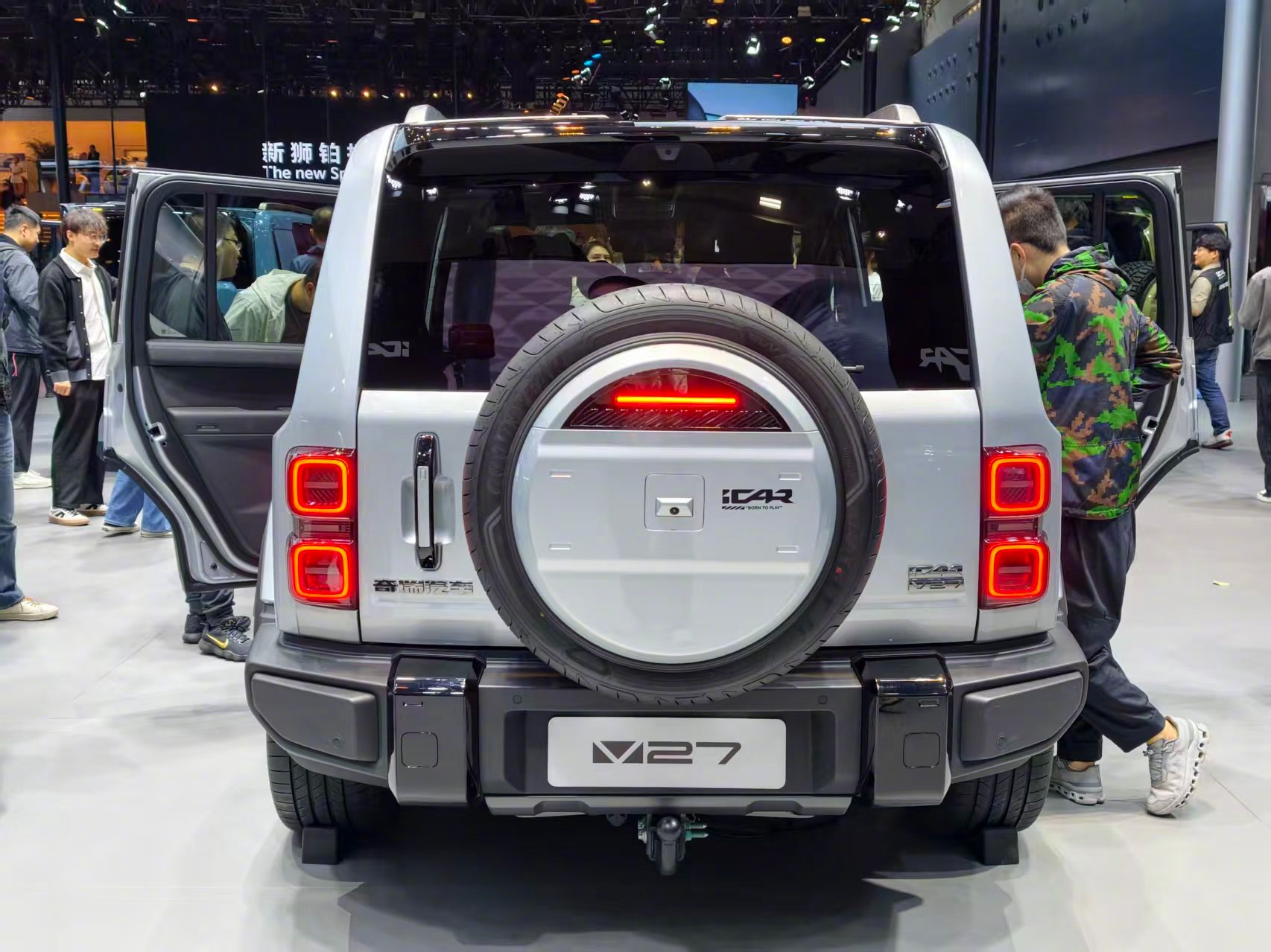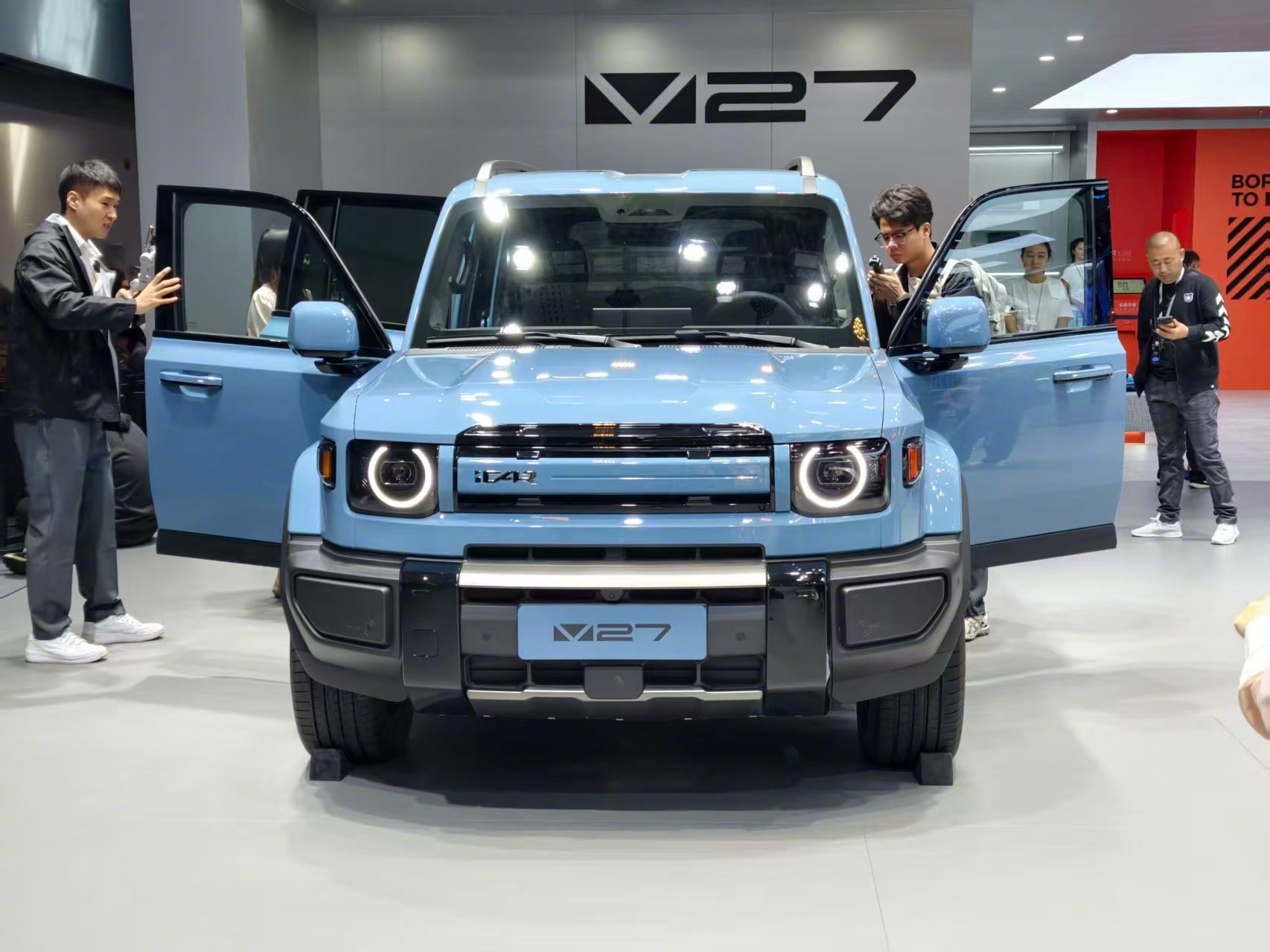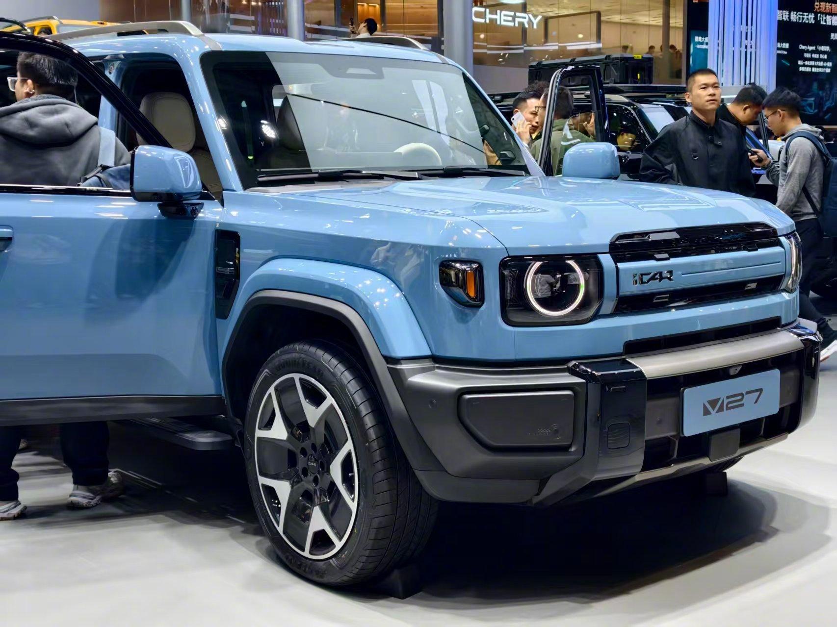 在广州车展现场,这个 iCAR V27 的展台真不错,这台 iCAR V27 方盒子造型,视野直观、辨识度极高。车身裸色涂装搭配粗犷黑色轮拱,辅以丰富个性车色选择,展现出强烈的年轻化与硬派气质。
