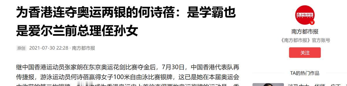 是爱尔兰前总理的侄孙女我忍了,是名校学霸钢琴八级我忍了,但是拒外队招揽只为中国香港拼奖牌我忍不了! 何诗蓓的混血模样看着就很特别,后来才知道她爸爸是爱尔兰人,妈妈是香港人,算起来还是爱尔兰前总理查尔斯・豪伊的侄孙女,这家世说出来够让人惊叹的吧?换旁人可能早就借着这层背景往更顺的路走了,可她偏偏一头扎进了泳池,没靠家世走半点捷径。 更让人意外的是这姑娘不光游泳厉害,背地里还是个 “全能选手”,4 岁就开始练钢琴,2014 年就拿下了八级证书,想想咱们身边能把琴练到八级的都没几个,更别说她还得兼顾高强度的游泳训练。 听说她高压训练累到不行的时候,就弹弹肖邦放松,指尖流淌的旋律成了她的 “镇定剂”,这天赋加毅力,真不是一般人能比的。 再说说读书这事她也没含糊,参加香港文凭试(DSE)的时候,硬是凭着真本事考出了七科 35 分的高分,要知道这考试竞争多激烈,多少人拼尽全力都未必能有这成绩。 之后她顺理成章考上了密歇根大学,攻读心理学专业,完全不是那种靠体育特长混文凭的运动员,实打实的名校学霸,按说有这学历毕业后安安静静当个儿童心理学家,或者靠钢琴技艺谋生,都是轻松又体面的选择,可她偏不非要在泳池里跟自己死磕,每天泡在充斥着消毒水味的池子里,挑战身体的极限。 如果说这些还只是让人觉得她优秀,那接下来这事,才真的让我彻底服了,因为她的双重背景,爱尔兰泳总早就盯上了她这块 “璞玉”,三番五次递来橄榄枝,想把她挖过去代表爱尔兰参赛。 换作任何人面对这样的诱惑可能都得动摇,毕竟爱尔兰泳坛的资源和平台摆在那儿,可何诗蓓的态度却刚得让人意外,不管是少年时期还是后来成名了,每次被问到她的回答都没变过,拒绝。 理由特别简单,她生于香港、长于香港,这片土地就是她的根,“为代表中国香港队感到骄傲” 这句 话,从来都不是什么场面话,而是她刻在骨子里的底线。 这份倔强最终让她在世界泳坛闯出了一片天,东京奥运会上,她游出 1 分 53 秒 92 和 52 秒 27 的好成绩,硬生生把香港在奥运游泳项目上 “零奖牌” 的历史翻了篇,两块银牌让整个香港都沸腾了。 可她没停下脚步在阿联酋的短池世锦赛上,女子 200 米自由泳决赛里,她一枪游出 1 分 50 秒 31,就凭着 0.12 秒的微弱优势,从瑞典名将手里抢下了世界纪录,把香港游泳带到了从未有过的高度。 之后的巴黎奥运会,她又拿下两枚铜牌,第十五届全运会上再添两金,就连当初见证她从初学者成长为世界冠军的南华会泳池,如今都用她的名字命名了,这份统治力真是靠一场场比赛拼出来的。 当然冠军也不是完美的,杭州亚运会上,她夺冠后没跟唱国歌的事引发了不少争议,后来这姑娘也坦诚回应,说当时夺冠太激动,脑子一片空白,加上确实对旋律不太熟悉,整个人都懵了。 其实这反而让人觉得真实,毕竟她可是为了备战全运会,能狠心放弃世锦赛的 “拼命三郎”,那份想在本土赛事上为香港争气的渴望根本藏不住,林郑月娥说她给 “香港体育划上完美句号”,可在我看来这哪里是句号,分明是个一直在加码的惊叹号。 想想看有显赫的家世可以依靠,有钢琴和学业的天赋可以另辟蹊径,何诗蓓明明有无数 “躺赢” 的选择,可她偏偏选了最苦、最具挑战性的一条路。 拒绝外队的高薪招揽,守着自己的根,日复一日在泳池里挥洒汗水,只为给中国香港争荣誉、拿奖牌,这样的姑娘不光有实力更有骨气,难怪让人忍不住感叹,那些家世、才华都能忍,可这份坚定和热爱,是真的忍不了,太让人敬佩了! (信息来源:南方都市报——为香港连夺奥运两银的何诗蓓:是学霸也是爱尔兰前总理侄孙女)