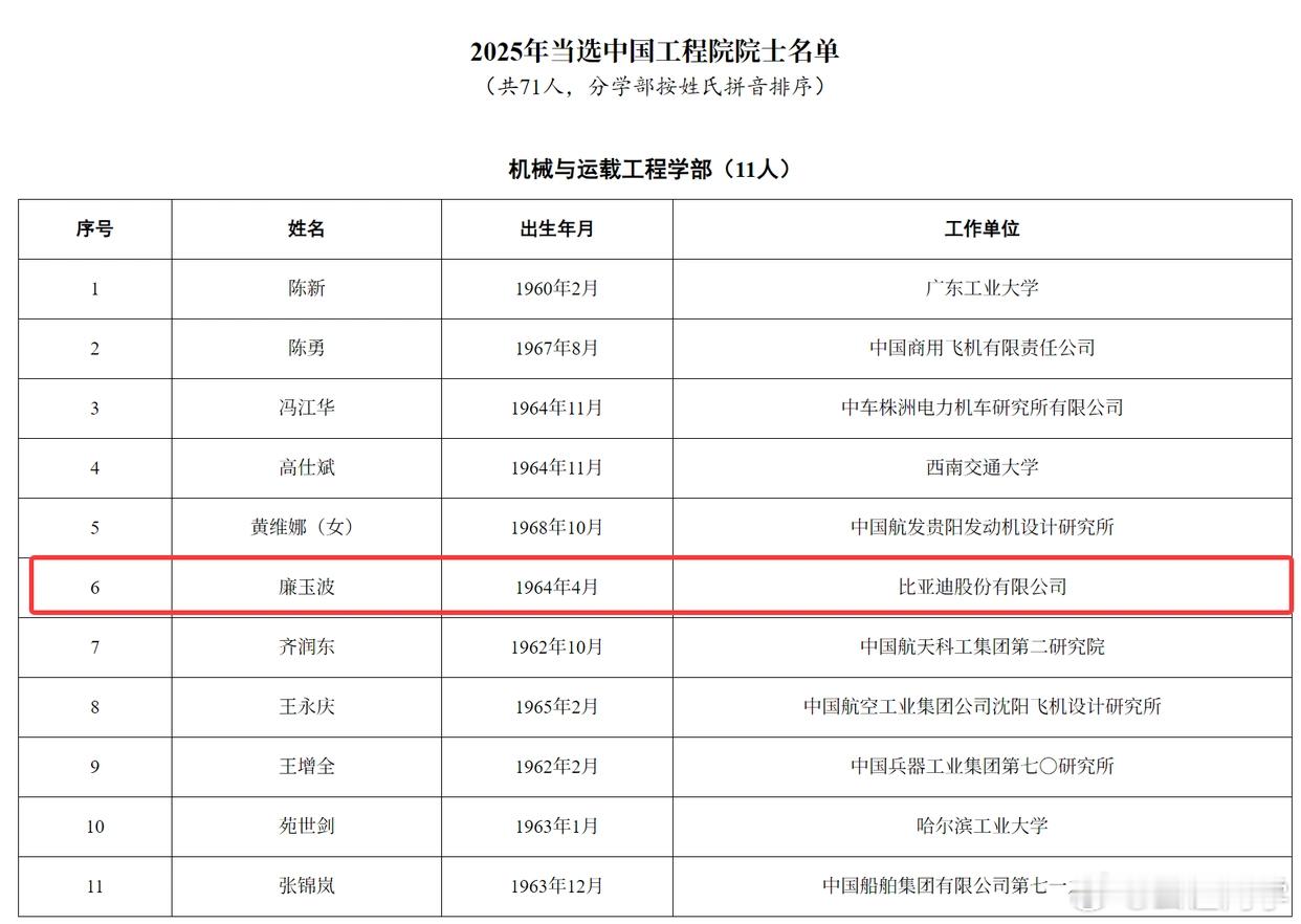 比亚迪廉玉波,正式当选中国工程院院士。在今日中国工程院发布的院士增选名单当中,比亚迪廉玉波当选中国工程院机械与运载工程学部院士;宁德时代新能源科技股份有限公司的吴凯当选中国工程院能源与矿业工程学部院士。比亚迪工程师的含金量还在上升