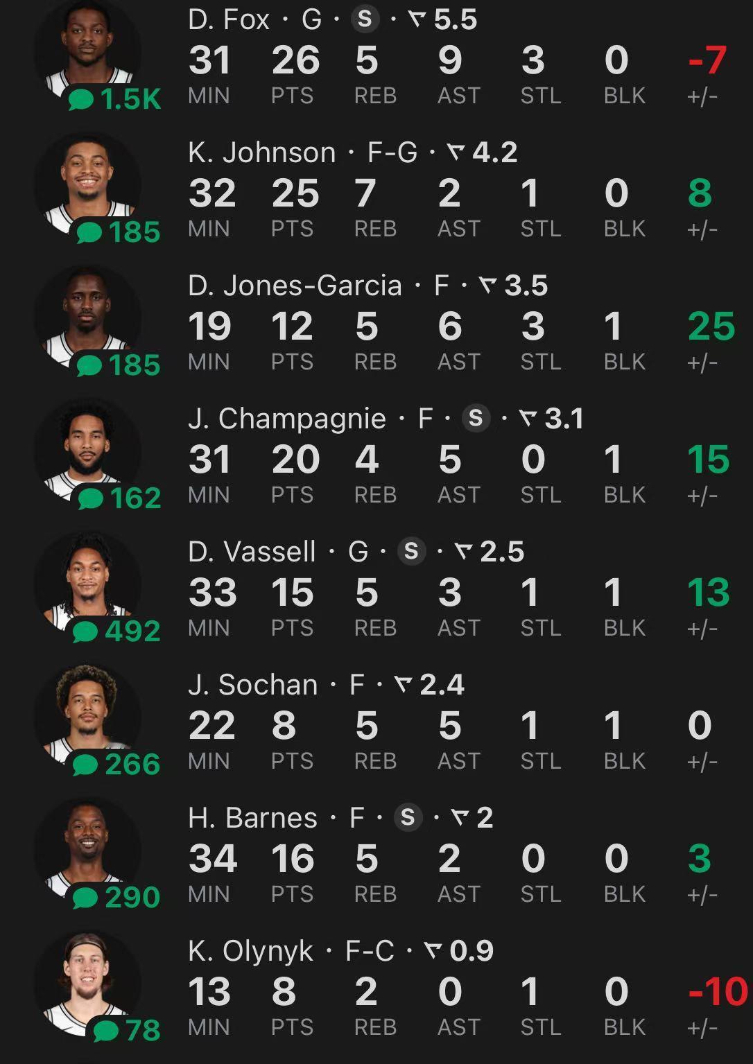 没有文班、卡斯尔、哈珀,马刺依然延续三连胜,送给老鹰两连败。马刺10人轮换,3人20+,6人上双,8人至少得到8分。