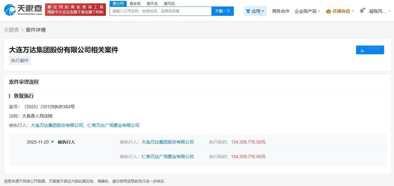 万达集团等被恢复执行1.34亿 天眼查天眼风险信息显示,近日,大连万达集团股份有限公司、仁寿万达广场置业有限公司新增1条恢复执行信息,执行标的1.34亿余元,执行法院为大邑县人民法院。 大连万达集团股份有限公司成立于1992年9月,法定代表人为王健林,注册资本10亿人民币,经营范围包括商业地产投资及经营、酒店建设投资及经营、连锁百货投资及经营、电影院线等文化产业投资及经营等。股东信息显示,该公司由大连合兴投资有限公司、王健林共同持股。 天眼查信息: