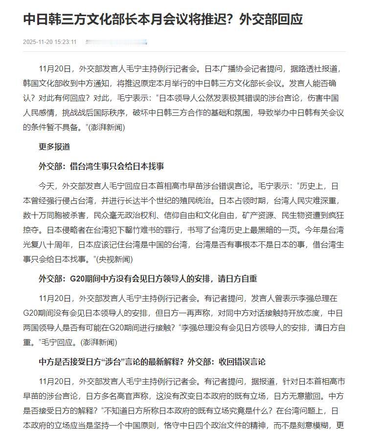 根据路透社11月20日的报道,韩国已经收到中方的通知,原定于月底在澳门举办的中日韩三国文化部长会议被推迟。 这说明,随着中日关系的遇冷,这种影响已经开始影响到第三国了。 对此,外交部发言人毛宁给出的解释是:日方的错误言论,挑战国际秩序,破坏中日韩三方合作的基础和氛围,所以现在不具备举办此类会议的条件。 韩国这次是实打实的“躺枪受害者”,毕竟中日韩三国文化产业早就绑在了一起,占了东亚文化市场的八成以上份额。 就说旅游这块,韩国旅游部门之前算过一笔账,原本借着这次文化会议,三方要推出“东亚文化遗产联程游”,把中国故宫、韩国景福宫、日本京都古迹串起来,预计每年能给韩国带来50万中国游客,直接拉动30亿人民币的旅游收入。 结果会议一推迟,联程游的审批、线路对接全停了,韩国济州岛的酒店已经开始退订明年的团体房,旅行社老板吐槽“本来指望这波回血,现在只能喝西北风”。 文化产业的连锁反应更明显。 韩国SM娱乐公司本来押宝这次会议,计划推出中日韩联合演唱会,邀请周杰伦、防弹少年团和日本岚组合同台,门票预售渠道都准备好了,结果会议推迟后,中方的审批流程直接卡住,前期砸的2000多万宣传费打了水漂。 还有韩国的动漫公司,本来想通过三国合作平台把《英雄联盟》衍生动画卖到中日市场,现在渠道断了,订单黄了近千万,只能裁掉三十多个员工。 这些损失都得算在日方头上,毕竟是他们的错误言论把合作的大门关上了。 可能有人觉得“不就是个会议推迟吗”,但这背后是三方多年的合作积累。 之前三国搞的“东亚文化遗产保护计划”已经推进三年,投入近亿元,本来要在这次会议上敲定申报世界文化遗产扩展项目的细节,现在只能无限期延后。 要知道,这个项目能带动三国的文物修复、学术交流和文创产业,单是韩国的景福宫周边文创,去年就靠中日游客卖了5个亿,现在全成了泡影。 日方其实也不是没好处,他们2024年的经常项目顺差涨了29.5%,达29.26万亿日元,很多人觉得他们能靠经济硬撑,但文化合作的损失是隐性且长远的。 中日文化产品贸易2024年1到10月降了18.7%,动漫、影视合拍项目停了一多半,这些领域的信任重建比赚钱难多了。 更讽刺的是,石破茂一边说“日本无意与中国脱钩断链”,一边用实际行动把合作的路堵死,这种自相矛盾的操作,连韩国媒体都看不下去,评论说“日本的错误言论就像老鼠屎,坏了三国文化的一锅粥”。 韩国现在的处境特别尴尬,夹在中间进退两难。 他们既想跟中国保持文化交流——毕竟中国游客撑起了韩国旅游的半壁江山,大熊猫“福宝”在韩国的热度还没降,“带父母去张家界”的说法还在流传;又不想得罪日本,只能默默承受会议推迟的后果。 这种“躺枪”的滋味不好受,但根源很清楚,就是日方不懂得“合作先讲尊重”的道理。 说到底,文化交流就像交朋友,得真诚待人,不能当面一套背后一套。 日方要是真想来谈合作,就得先管住自己的嘴,停止那些挑战国际秩序、损害中方核心利益的言论,别再搞供奉战犯、挑衅领土主权的小动作。 不然的话,别说文化会议,就算是经济、贸易等其他领域的合作,也会被他们自己的错误言行拖后腿。 韩国的“躺枪”只是个开始,再这么下去,日方迟早会把自己的路走窄,到时候可别怪没人愿意跟他合作了。