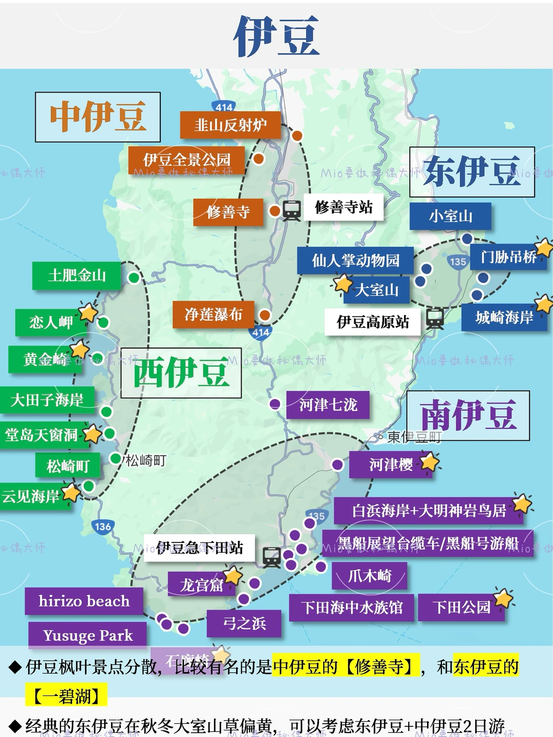 📍伊豆:经典游览区域东伊豆的大室山在秋季草已经偏黄,但是秋冬季节去伊豆泡温泉也很好,伊豆枫叶代表是中伊豆的修善寺
