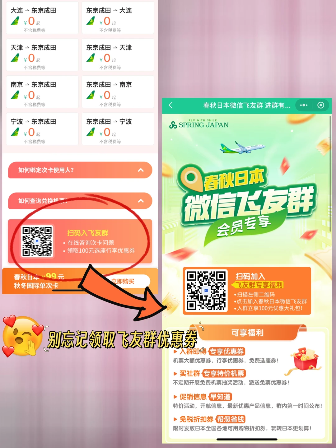 🍬加入春秋日本飞友群,可以领取合计100元的选座行李优惠券