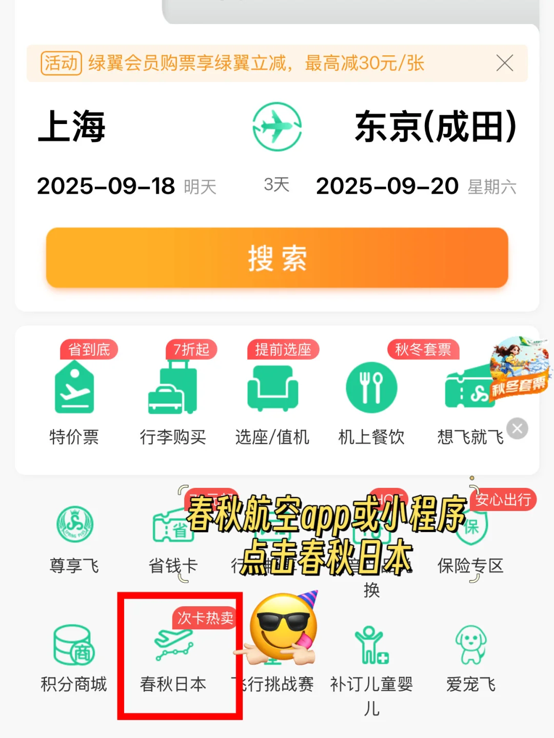 👉在春秋航空app或者小程序上点击“春秋日本”主页即可进入购买