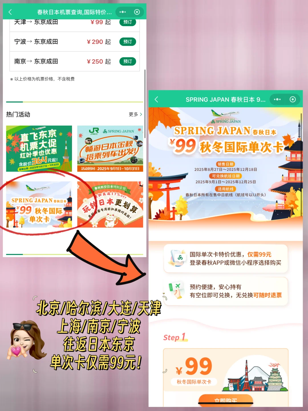 👉春秋日本最近推出【99元秋冬国际单次卡】活动,可兑换2025年9月1日~12月25日的东京成田=北京首都、上海浦东、哈尔滨、大连、天津、南京、宁波的航线