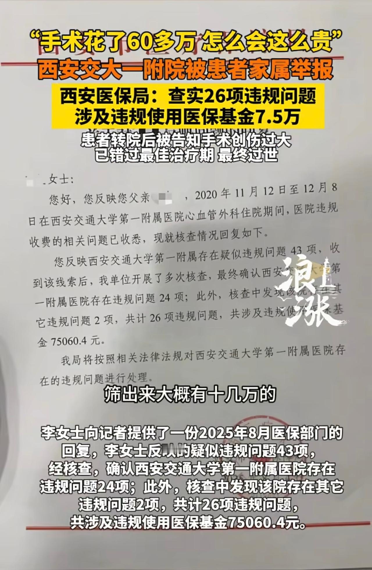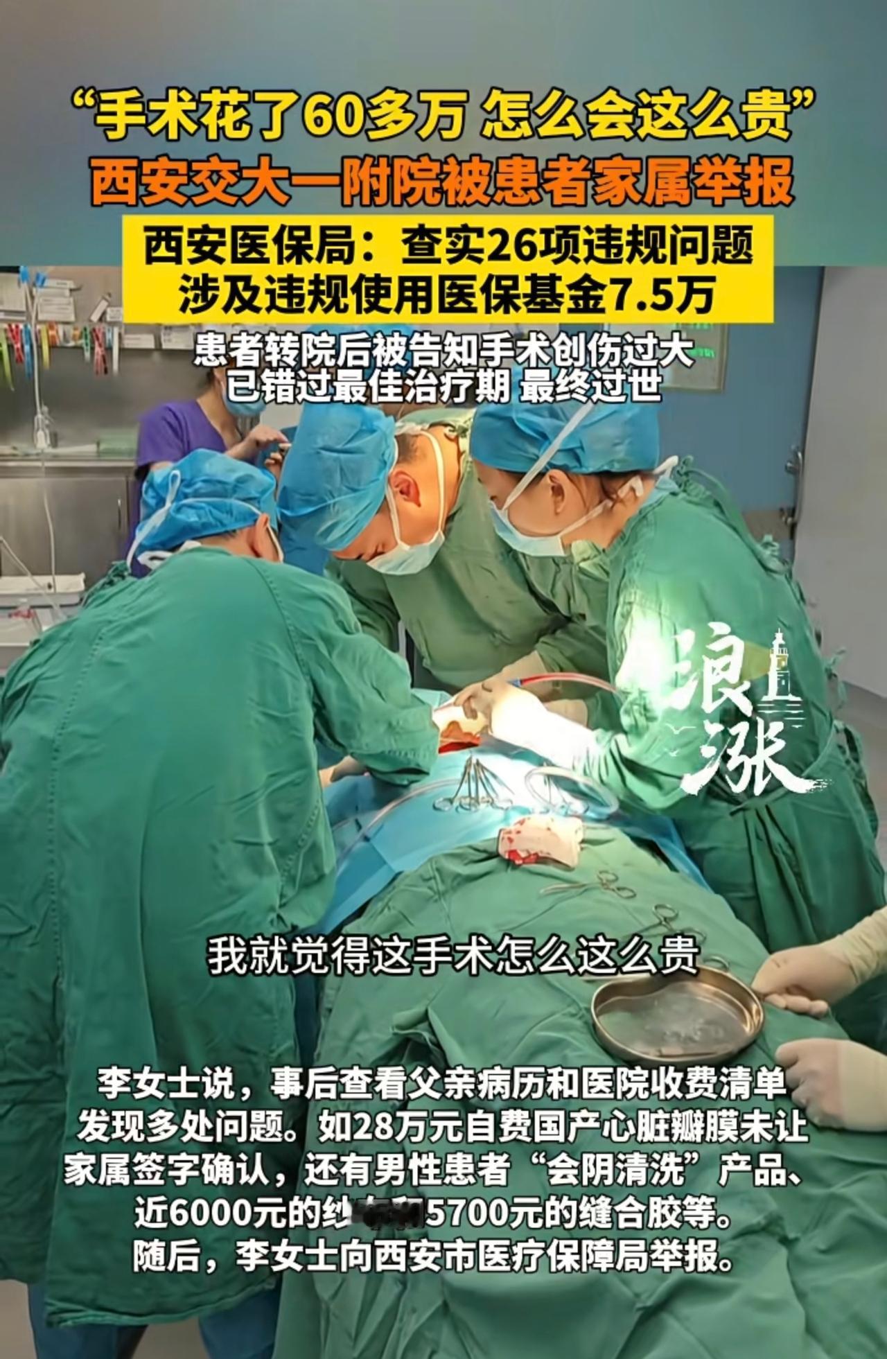 西安一所医院又火了,不是因为医院多高的技术,而是因为高额的手术医疗费。 老人因心脏问题住院,结果术后昏迷住进了ICU,家属想转院治疗,结算时共计花费61万,其中国产瓣膜28万、纱布花费6000元、5700元的缝合胶,而这些仅仅一小部分,竟然未告知家属,28万更是无家属签字就使用了。家属反馈给医保局后,查出了26项违规项目,如果这些问题挨个核实,又可以省下不小的花费。 有几个老百姓家能承受这么高昂的费用,如果没有发现问题,即便报销一半也要30多万,有多少患者因为高额的费用保守治疗,普通小手术都要几万,大的手术更是穷尽一生的拼搏换来一次救命机会。 本来医疗费用就很高,现在还各种方式动手脚,这哪里是救死扶伤的地方,已经变相成为敛财的吸血鬼,希望有关部门好好通查这类问题。陕西医院乱象