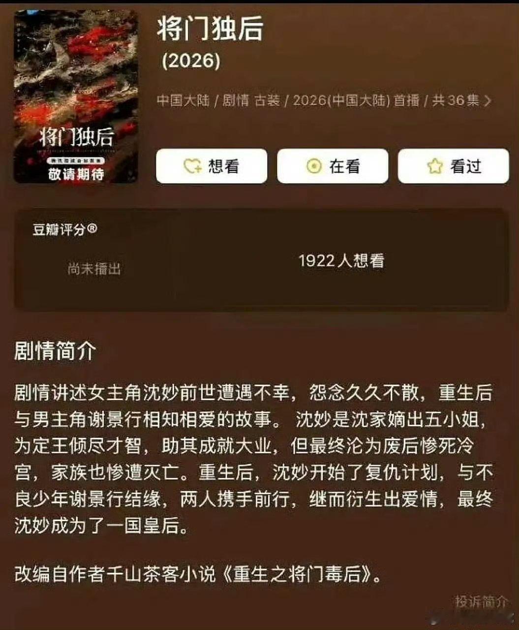 【女主孟子义换杨超越】🍉36集古装电视剧《将门独后》改编自千山茶客小说,明年二月开机!出品公司:新丽电视/阅文影视领衔主演:王鹤棣 杨超越 张淼怡 王星越 李雪琴 沈月(按照剧情出场顺序排列,排名不分先后)特邀主演:鹤男 全伊伦特别邀请:官鸿 黄羿 特别出演:彭小苒 乔振宇 赵子琪 杨仕泽特邀出演:刘晓庆 李嘉琦 邱心志 严浩翔联袂主演:王润泽 王同辉 刘佳玺 付磊 杜奕衡 黑泽 闵政友情出演:罗嘉良 斓曦 张兆辉 卢星宇