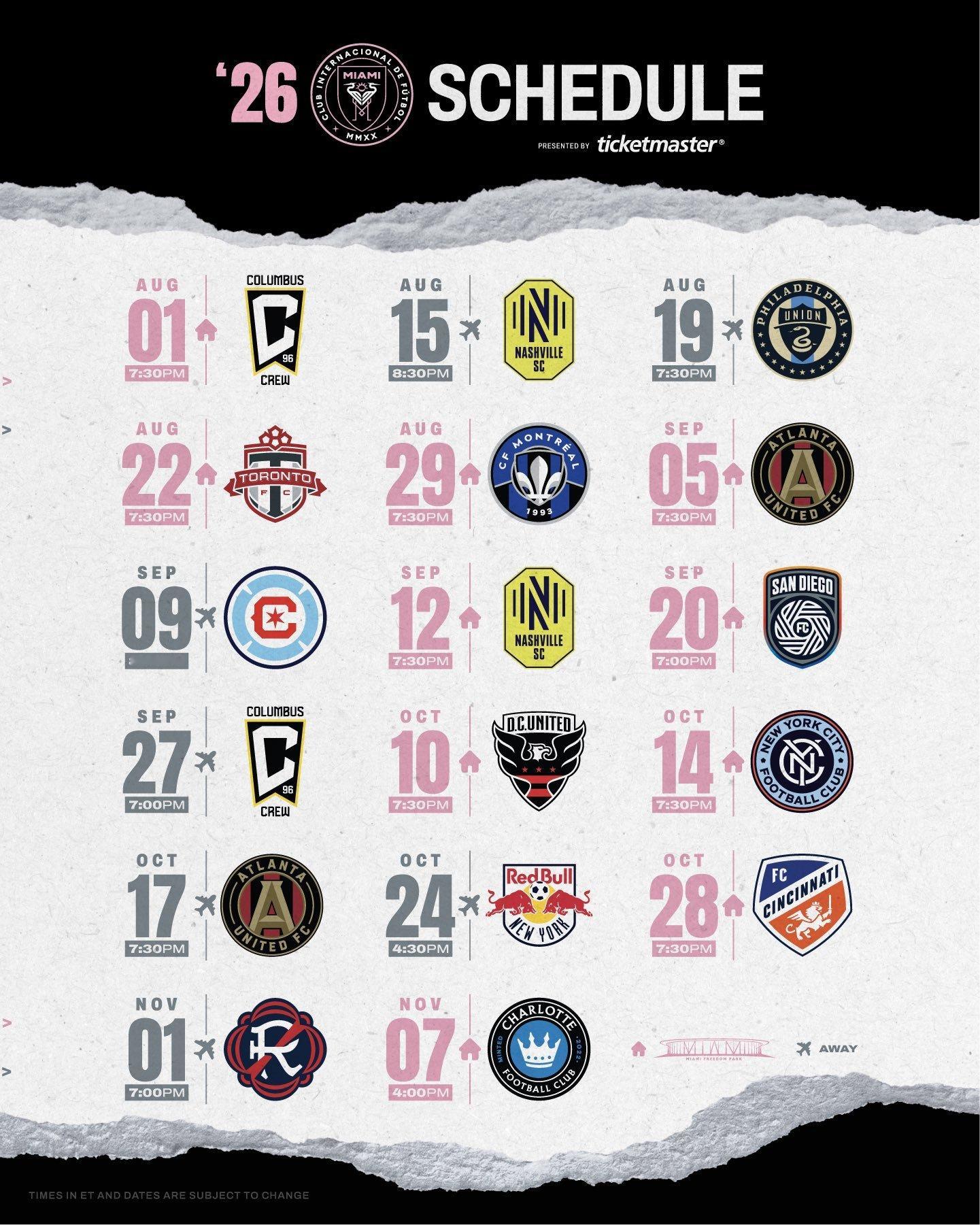迈阿密国际发布2026赛季美职联的赛程表:迈阿密国际新赛季的首场比赛将在2月21日客场对阵洛杉矶FC,新主场首秀将在4月4日对阵奥斯汀FC。