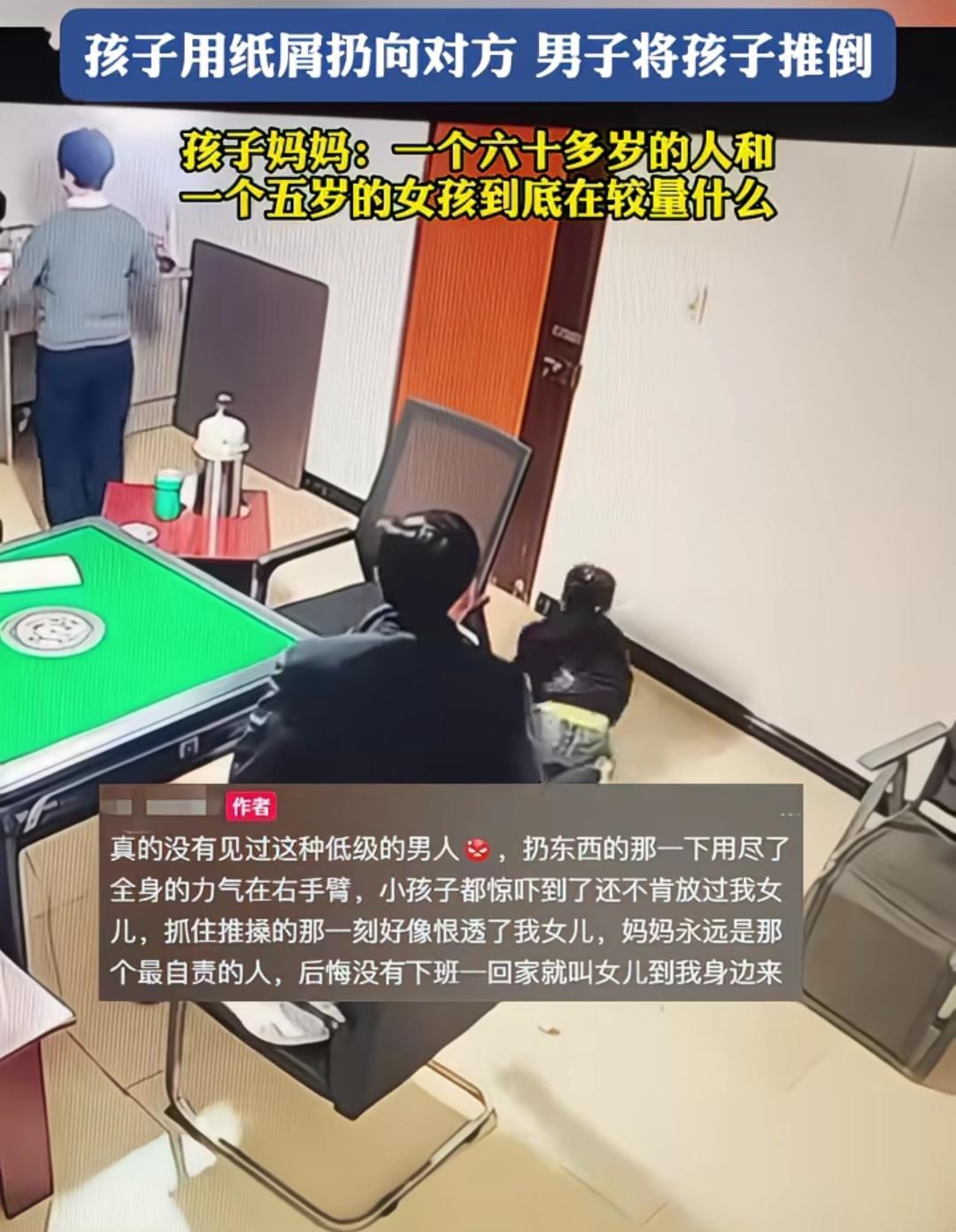 浙江一小孩拿纸团扔邻居,邻居将小孩推倒在地。根据视频内容,小孩奶奶背对着邻居男子在边看手机边跳舞,邻居男子坐在牌桌前,用手指着小女孩说着什么,小女孩就很生气的来到男子身后朝他扔纸团,男子就把女孩一把提起扔倒在地。女孩母亲称,没见过这种低级的男人,我女儿都被他吓到了还不放过,抓起推搡的那一刻好像恨透了我女儿,后悔没一下班就把女儿叫到身边来,60多岁的人了跟一个5岁女孩计较什么!