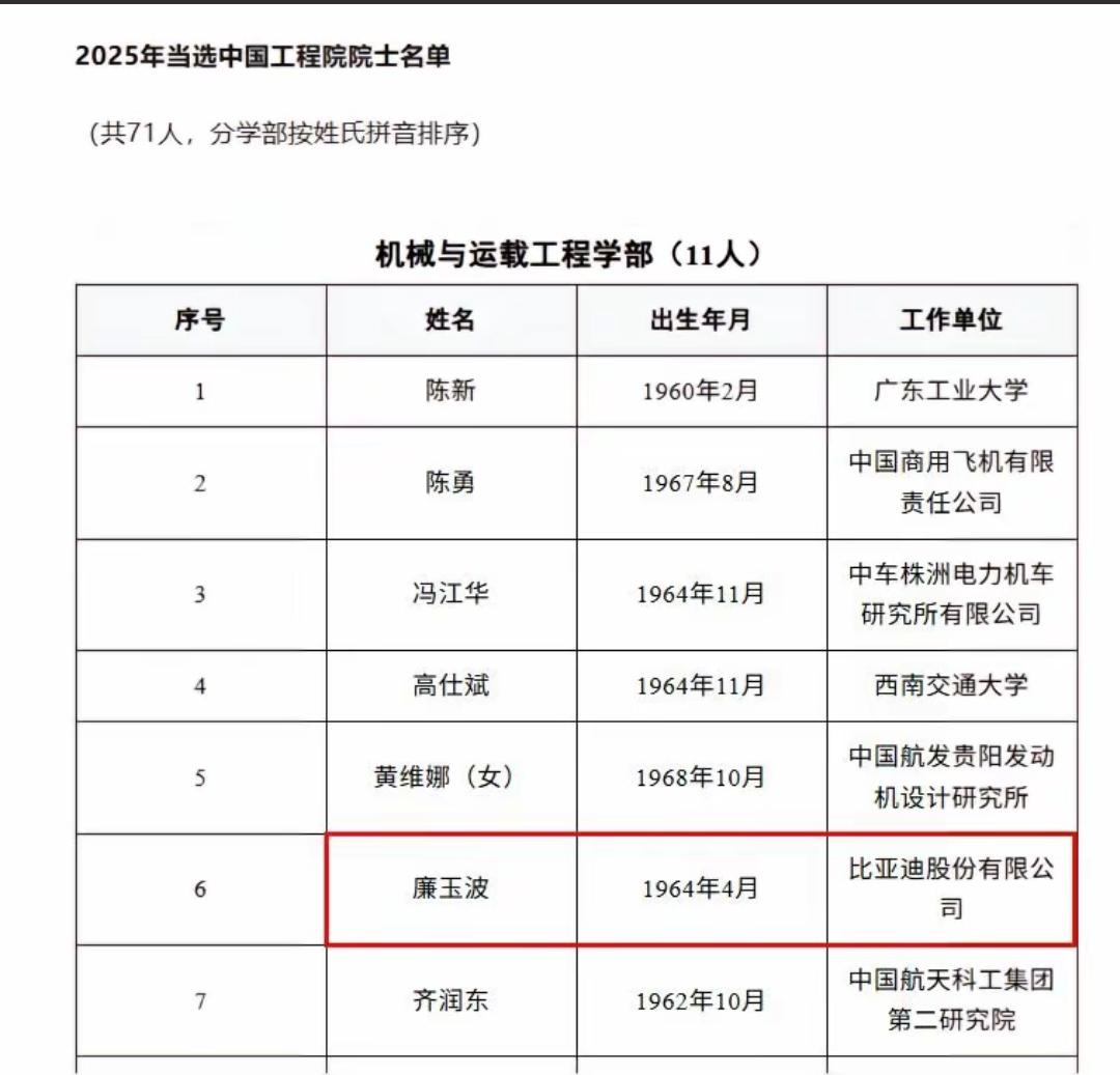 热烈祝贺比亚迪廉玉波当选中国工程院院士! 私企里面出院士这个含金量就不用多说了吧,要知道私有企业都是以利润为导向型的,能出一个两院院士非常的难。 廉玉波就当选了中国工程院院士,这说明比亚迪人才济济确实有实力,确实在研发国际领先的项目,而且取得了重大成果。 各位是怎么看的?欢迎评论区留言。