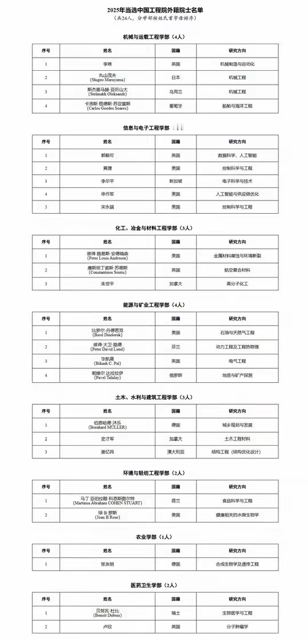 2025年两院院士增选结果揭晓 144人当选!比亚迪一人当选院士! 最有意思的是比亚迪也有一人当选院士,其他的大部分是高校或者是科研单位,今年当选的外籍院士数量也是比较多的。 两院士能够当选都是所在学科佼佼者,目前我国的两院院士当选之后都是终身的名誉,社会影响力非常的大, 各位是怎么看的?欢迎评论区留言,