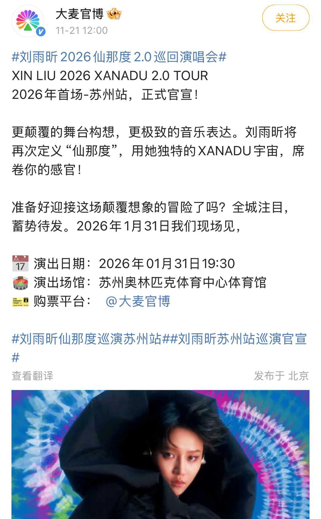 刘雨昕2026仙那度2.0巡回演唱会苏州站官宣