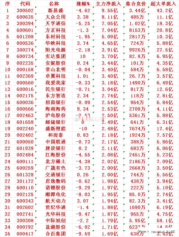 11月21日开盘45分钟,主力资金“买入的 ”的35名单一览!新易盛:净流入 9.55亿元,超大单流入 43.2亿元大众公用:净流入 8.11亿元,超大单流入 11.1亿元天孚通信:净流入 7.05亿元,超大单流入 18.3亿元方正科技:净流入 7.04亿元,超大单流入 20.8亿元东材科技:净流入 5.09亿元,超大单流入 10.3亿元