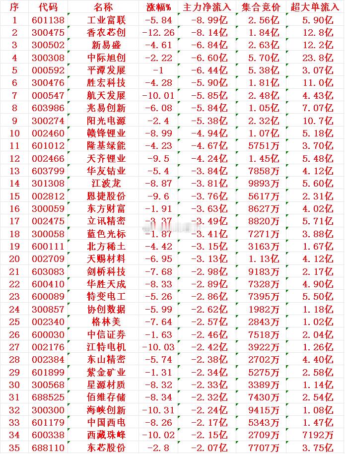11月21日开盘45分钟,主力资金“卖出的 ”35名单!工业富联:净流入 -8.99亿元香农芯创:净流入 -8.14亿元新易盛:净流入 -6.84亿元中际旭创:净流入 -6.60亿元平潭发展:净流入 -6.44亿元