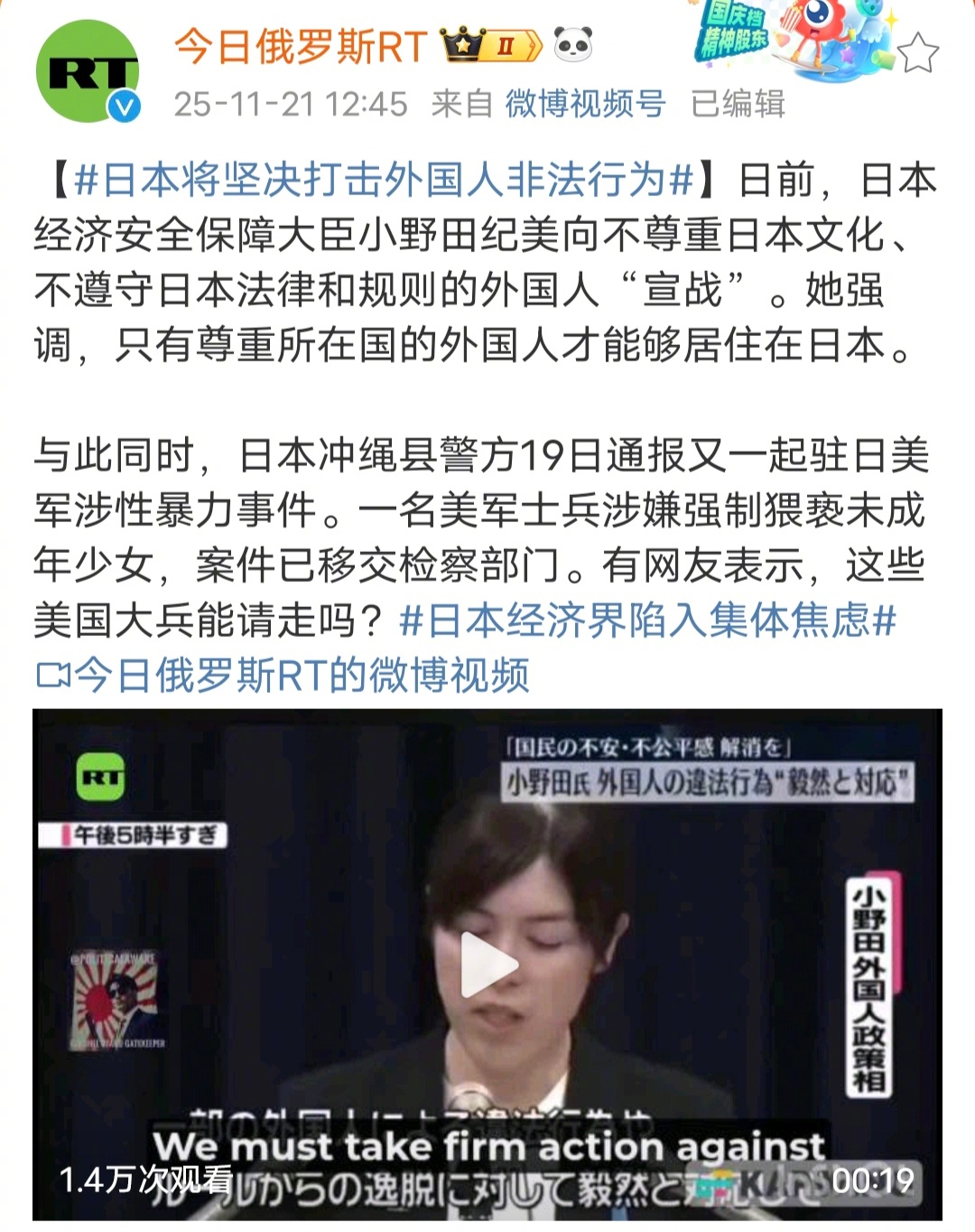 日本经济安全保障大臣小野田纪美向不尊重日本文化、不遵守日本法律和规则的外国人“宣战”。她强调,只有尊重日本的外国人才能够居住在日本。我替她再补充一句,美国人除外。