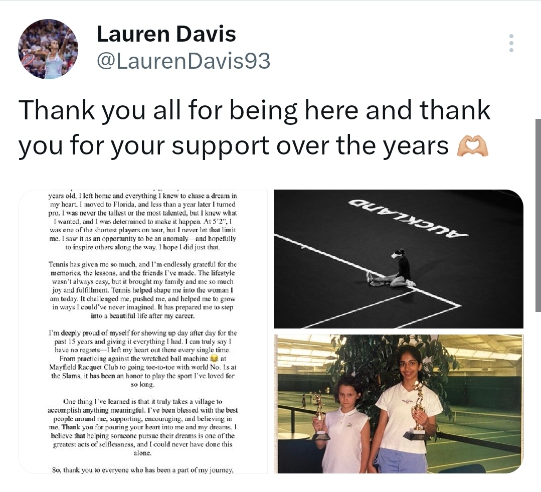 戴维斯宣布退役🎙32岁的美国选手戴维斯宣布告别职业网坛。她职业生涯最高排名第26位,名下有两个WTA单打冠军(2017奥克兰、2023霍巴特),曾经五次击败世界前十。你对她印象最深的是?