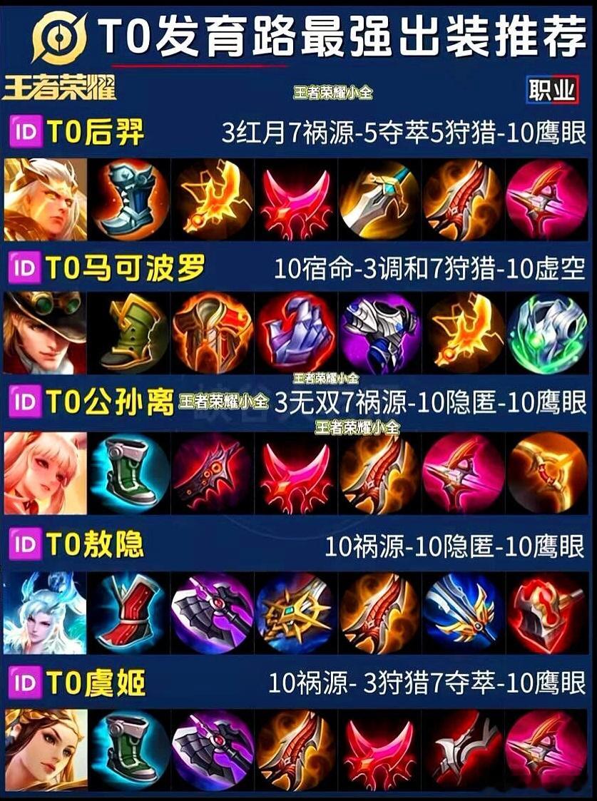 以下是《王者荣耀》中这10位打野英雄“万爆流”出装与铭文的解析:1. 孙悟空- 铭文:10无双、3隐匿7夺萃、10鹰眼- 无双提供暴击率与暴击效果,隐匿提升物理攻击和移速,夺萃补充吸血减少续航压力,鹰眼增加物理穿透。- 出装:红色打野刀、攻速鞋、无尽战刃、宗师之力、破晓、破军- 红色打野刀叠攻速和打野效率,攻速鞋提升攻速,无尽战刃和宗师之力是孙悟空核心输出装,强化暴击伤害与爆发,破晓增加物理穿透,破军进一步提升收割能力,让孙悟空能轻松打出“万爆”伤害。2. 铠- 铭文:3无双7祸源、10狩猎、10鹰眼- 无双和祸源增加暴击率与暴击效果,狩猎提升攻速和移速,鹰眼增加物理穿透,让铠的暴击伤害更可观且追击能力强。- 出装:红色打野刀、攻速鞋、暗影战斧、无尽战刃、宗师之力、破军- 红色打野刀叠层,攻速鞋提升攻速,暗影战斧提供穿透和冷却缩减,无尽战刃和宗师之力强化暴击爆发,破军让铠的收割能力拉满,这套出装能让铠在团战中一刀秒杀脆皮。3. 典韦- 铭文:3红月7祸源、10隐匿、10鹰眼- 红月提供攻速和暴击率,祸源增加暴击率,隐匿提升物理攻击和移速,鹰眼增加物理穿透,平衡了典韦的攻速、暴击和穿透需求。- 出装:红色打野刀、攻速鞋、反伤刺甲、无尽战刃、宗师之力、破军- 红色打野刀叠层,攻速鞋提升攻速,反伤刺甲提升坦度和反伤效果,无尽战刃和宗师之力强化暴击伤害,破军提升收割能力,让典韦既能抗又能打出高额暴击伤害。4. 镜- 铭文:2红月3无双5异变、5隐匿5狩猎、10鹰眼- 红月提供攻速,无双和异变增加暴击率与物理攻击,隐匿和狩猎提升物理攻击、移速和攻速,鹰眼增加物理穿透,让镜的技能衔接更流畅且伤害爆炸。- 出装:红色打野刀、攻速鞋、暗影战斧、无尽战刃、宗师之力、破军- 红色打野刀叠层,攻速鞋提升攻速,暗影战斧提供穿透和冷却缩减,无尽战刃和宗师之力强化暴击爆发,破军提升收割能力,这套出装让镜的每一次镜像打击都能造成巨额伤害。5. 刘备- 铭文:3红月7异变、3夺萃7狩猎、10鹰眼- 红月和异变提供攻速和物理攻击,夺萃补充吸血,狩猎提升攻速和移速,鹰眼增加物理穿透,让刘备的贴脸输出更持久且伤害高。- 出装:红色打野刀、攻速鞋、暗影战斧、无尽战刃、宗师之力、破军- 红色打野刀叠层,攻速鞋提升攻速,暗影战斧提供穿透和冷却缩减,无尽战刃和宗师之力强化暴击爆发,破军提升收割能力,这套出装让刘备近距离作战时能快速打出“万爆”伤害,轻松秒杀敌人。6. 后羿- 铭文:3红月、7祸源、5夺萃、5狩猎、10鹰眼- 红月提供攻速和暴击率,祸源增加暴击率,夺萃补充吸血减少续航压力,狩猎提升攻速和移速,鹰眼增加物理穿透。- 出装:攻速鞋、闪电匕首、无尽战刃、破晓、影刃、逐日之弓- 攻速鞋叠攻速,闪电匕首进一步提升攻速和暴击,无尽战刃强化暴击伤害,破晓是射手核心装,影刃继续堆攻速,逐日之弓提供射程和攻速,让后羿在团战中能安全输出。7. 马可波罗- 铭文:10宿命、3调和、7狩猎、10虚空- 宿命提供生命值、攻速和物理防御,调和补充生命和回血,狩猎加攻速移速,虚空增加冷却缩减和生命值,这套铭文让马可波罗前期更肉且有攻速保障。- 出装:攻速鞋、末世、冰痕之握、反伤刺甲、闪电匕首、魔女斗篷- 末世是马可波罗核心装,提供攻速、吸血和百分比伤害,冰痕之握和反伤刺甲提升坦度与黏人能力,闪电匕首增加攻速暴击,魔女斗篷抵御法术伤害,这套出装让马可波罗能打能抗,适合当前版本节奏。8. 公孙离- 铭文:3无双、7祸源、10隐匿、10鹰眼- 无双和祸源增加暴击率与暴击效果,隐匿提升物理攻击和移速,鹰眼增加物理穿透,让公孙离前期伤害更足,机动性也有保障。- 出装:攻速鞋、暗影战斧、无尽战刃、破晓、逐日之弓、破军- 攻速鞋叠攻速,暗影战斧提供穿透和冷却缩减,无尽战刃强化暴击伤害,破晓提升整体输出,逐日之弓增加射程和攻速,破军进一步提升收割能力,这套出装让公孙离在各个阶段都有不错的爆发。9. 敖隐- 铭文:10祸源、10隐匿、10鹰眼- 祸源增加暴击率,隐匿提升物理攻击和移速,鹰眼增加物理穿透,最大化敖隐的暴击伤害和前期输出能力。- 出装:攻速鞋、暗影战斧、无尽战刃、破晓、破军、血魔之怒- 攻速鞋叠攻速,暗影战斧提供穿透和冷却,无尽战刃强化暴击,破晓是射手核心装,破军提升收割能力,血魔之怒增加坦度和伤害,让敖隐在团战中能持续输出并具备一定生存能力。10. 虞姬- 铭文:10祸源、3狩猎、7夺萃、10鹰眼- 祸源增加暴击率,狩猎提升攻速移速,夺萃补充吸血,鹰眼增加物理穿透,平衡了虞姬的暴击、吸血和穿透需求。- 出装:攻速鞋、暗影战斧、无尽战刃、破晓、影刃、破军- 攻速鞋叠攻速,暗影战斧提供穿透和冷却,无尽战刃强化暴击伤害,破晓提升输出,影刃增加攻速暴击,破军提升收割能力,这套出装让虞姬在面对坦克和脆皮时都有不错的杀伤力。