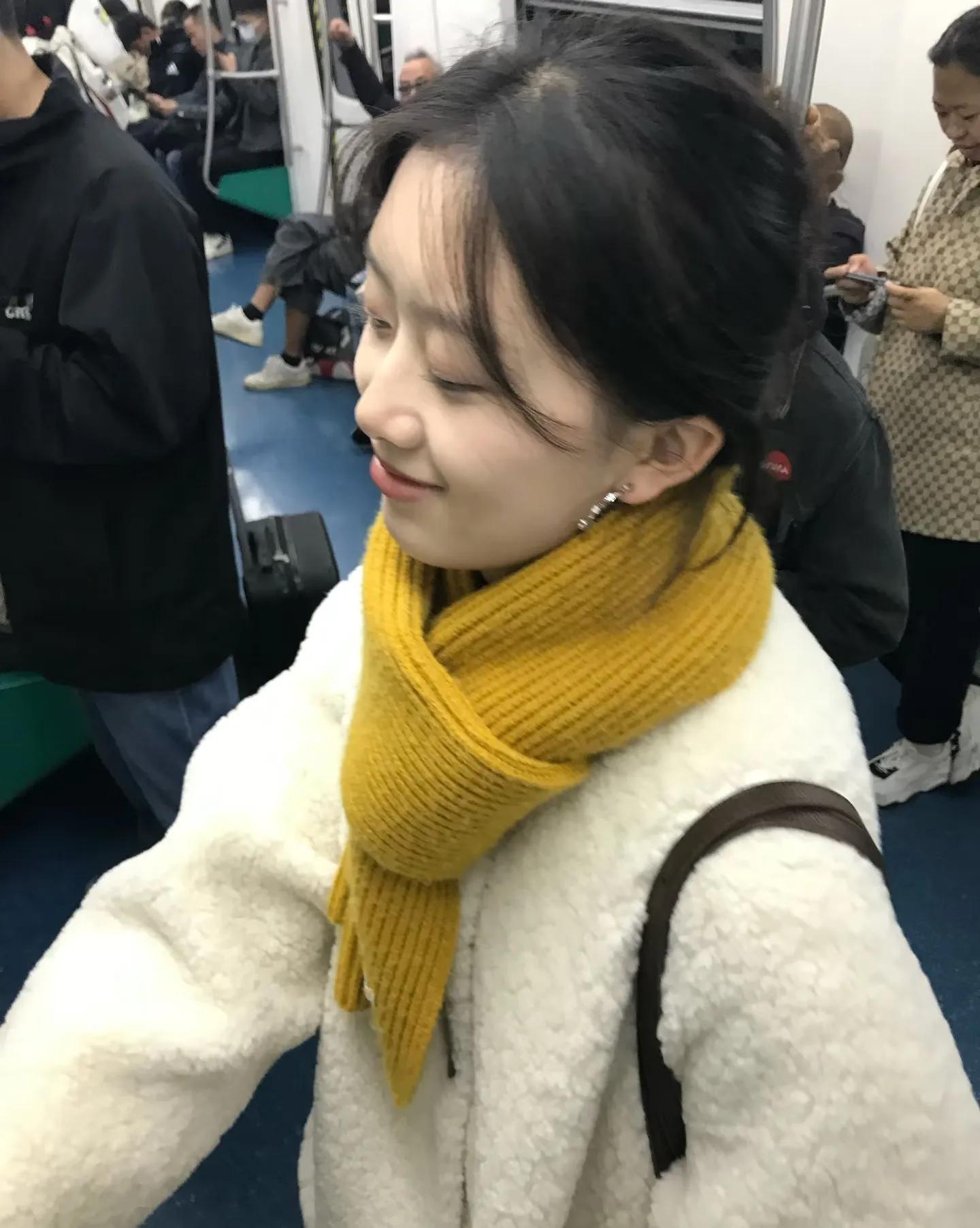 地铁上看到的美女,她真的太好看了吧,穿着白色抓绒衣,带着黄色的围巾,背着黑色的包包,穿着打扮真的很时尚啊。她脸真的好白呀,看着好洋气,好年轻,笑起来特别特别的好看。