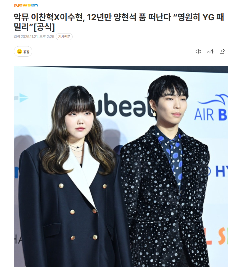 【YG就AKMU(乐童音乐家)将独立发展发表官方立场】 兄妹二人组合AKMU成员李赞赫和李秀贤将离开YG娱乐(以下简称YG)。YG于11月21日通过官方新闻稿表示:"大约6个月前,总制作人梁铉锡前往AKMU成员李赞赫和李秀贤居住的家中拜访,并共进了晚餐。大家一同享用了成员们亲自准备的食物,分享了从2012年通过选秀节目《Kpop Star 第二季》初次见面起的过去12年间种种快乐的回忆。同时,也针对AKMU目前正在烦恼的部分进行了真诚的交流。"YG接着说明道:"AKMU唯一的烦恼是,是否要继续与过去12年间同甘共苦的YG携手同行,或是为了新的挑战选择独立。梁总制作人向站在选择十字路口烦恼的AKMU传达了意见,认为他们先离开YG的怀抱,在新的环境中进行音乐活动也会是很好的经验,并鼓励了成员们,同时表达了将在背后给予支持的真诚心意。这是因为梁总制作人比任何人都了解始终渴望挑战新道路的AKMU的倾向与烦恼。在梁总制作人的应援与温暖的鼓励下,AKMU经过深思熟虑,最终决定挑战新的道路。"由此,AKMU在约12年后与YG分道扬镳。2013年作为SBS《Kpop Star 第二季》冠军出身的AKMU,当时选择了YG作为其所属社。之后,他们在2014年发布了收录包括主打曲《200%》、《Give Love》等歌曲的首张正规专辑,在过去12年间推出了众多热门歌曲,成为了名副其实的备受大众喜爱的兄妹二人组合。YG方面补充道:"AKMU成员们最后说道'我们永远是YG家族',并表达了随时召唤必会奔赴的心意。成员们各自向培养他们的梁总制作人递交了充满真心的亲笔信,甚至行了跪拜大礼以传达感谢之意。"
