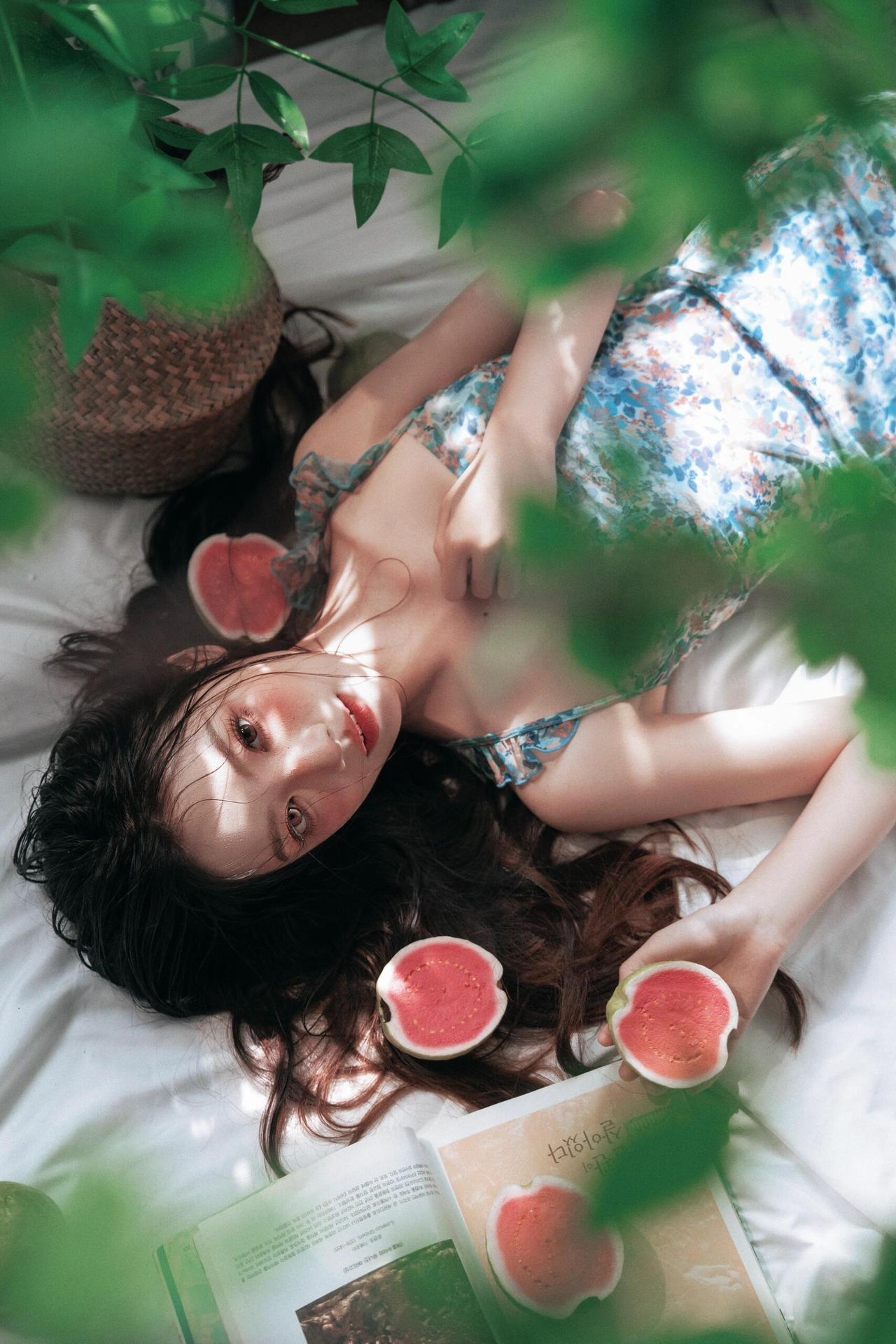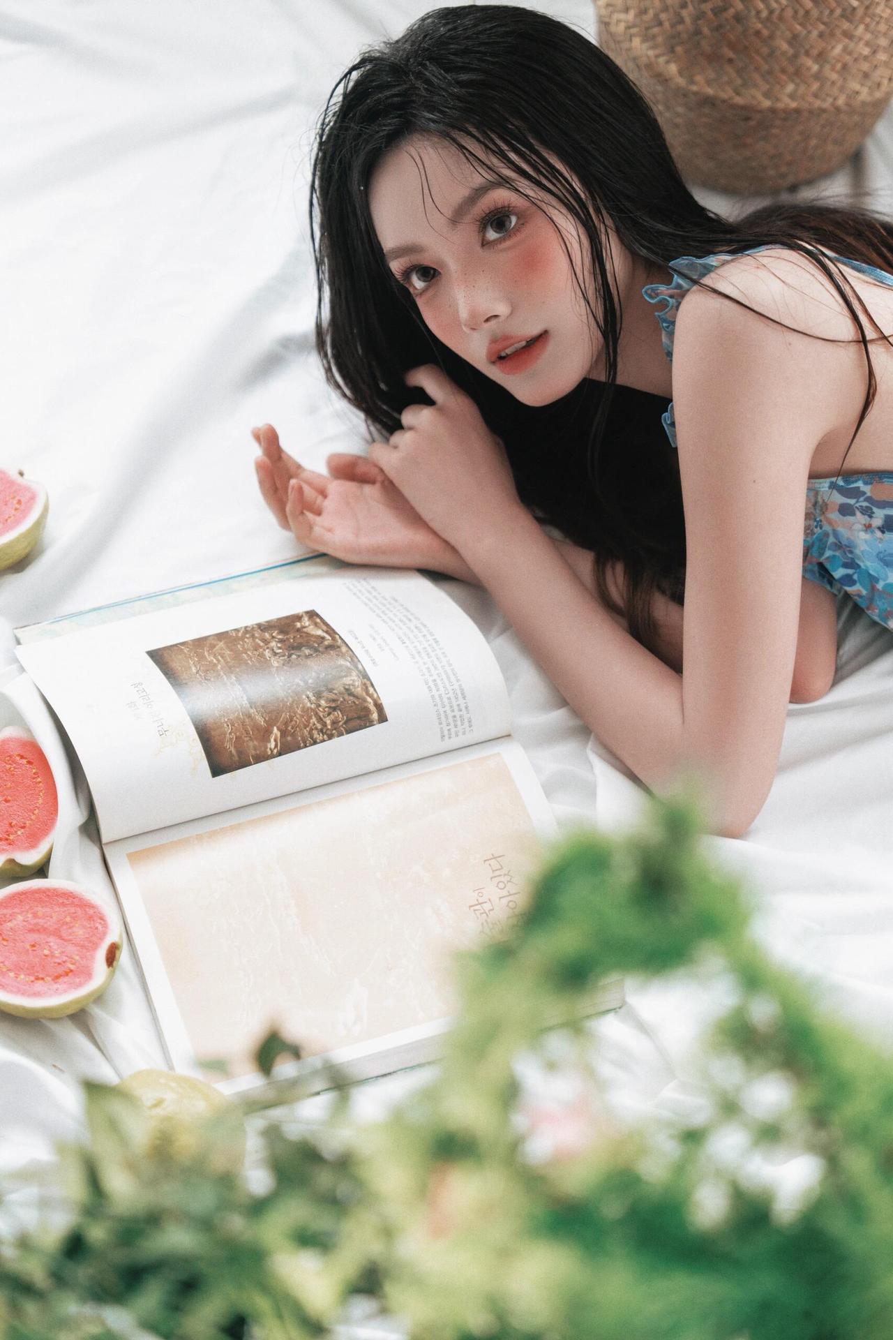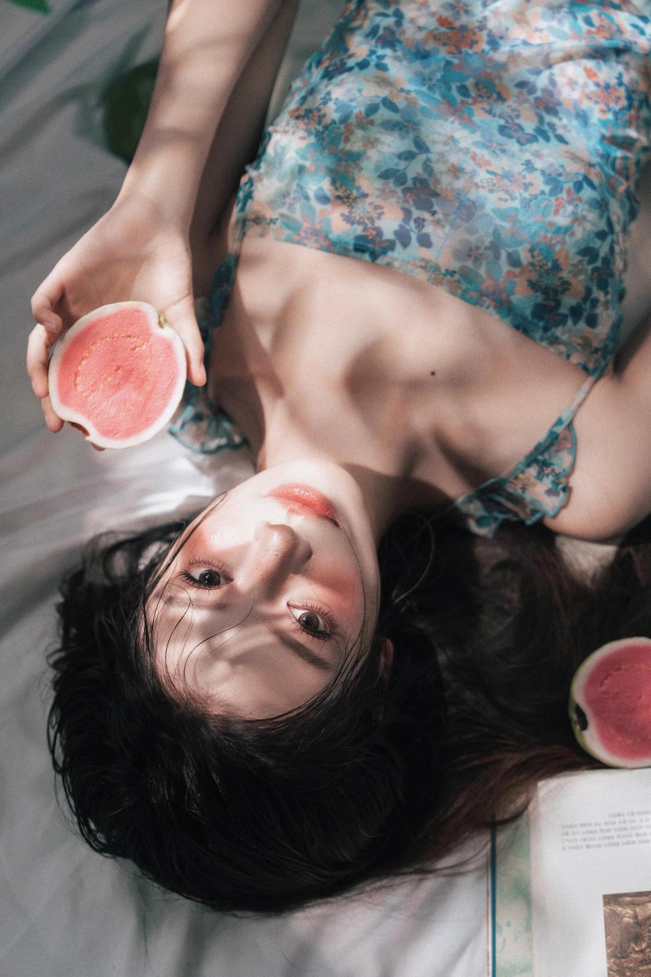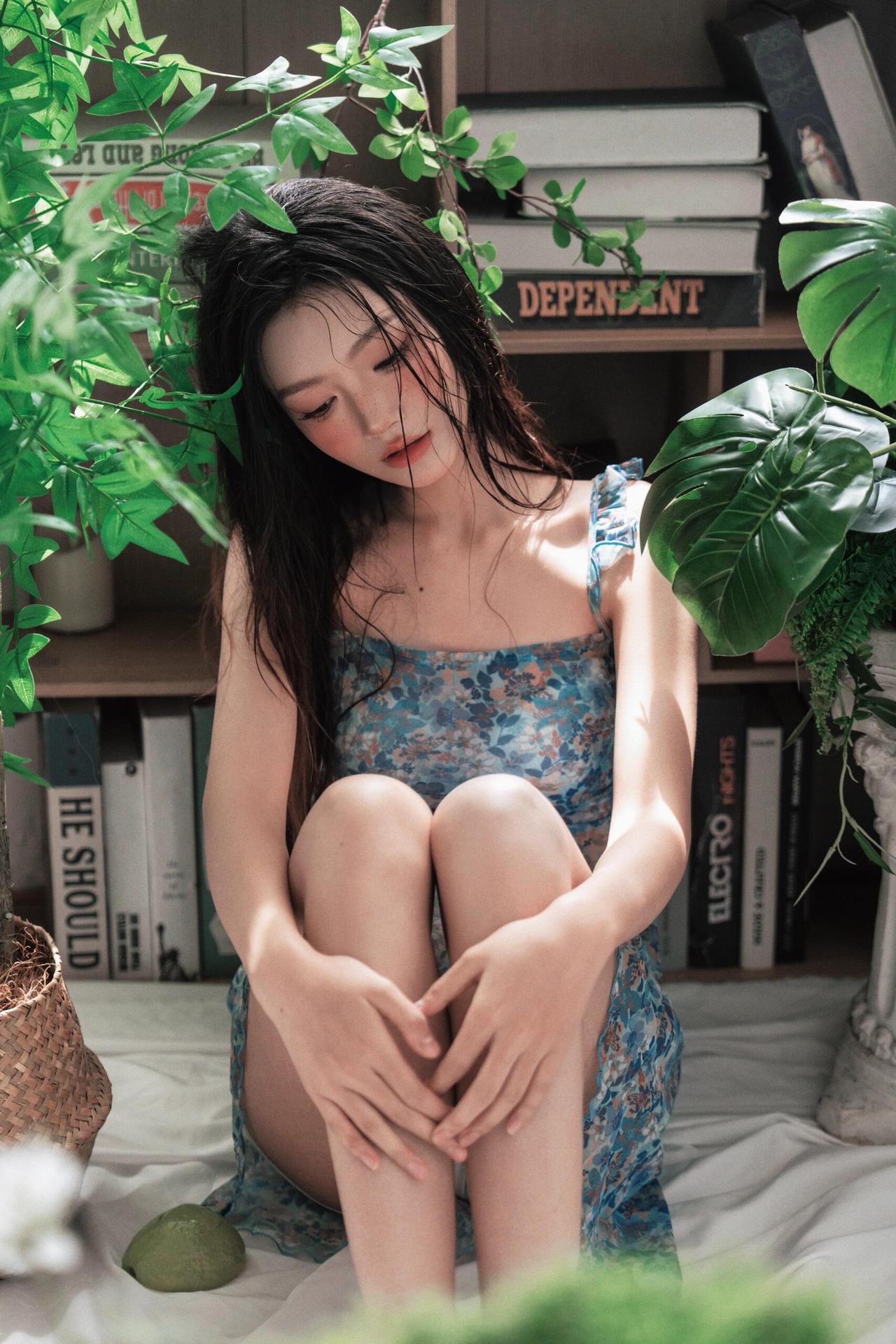 闺阁淑女作品,以“现代审美重构古典气质”为核心脉络。传统闺阁题材常绑定“端雅、规整”,而此作以“慵懒感”破题:人物或卧或坐,姿态无刻意的雕琢,发丝、裙摆的自然褶皱,让“淑女”回归到“生活中的女性”。 道具的选择是巧思:青柚的清新质感、书籍的文艺属性,替代了传统闺阁的琴棋书画,既贴合现代生活场景,又暗合“闺阁”的雅致内核;蓝底碎花裙的轻盈材质,让人物在柔光里呈现出“淡而不寡”的美感,色彩上的低饱和处理,也让画面避开了艳俗,守住了闺阁的温婉调性。 不足在于空间层次的缺失:背景的书架、绿植虽丰富了场景,但景深的过度虚化让环境沦为模糊的底色,若让部分背景元素(如书本封面)适度清晰,能让“闺阁”的空间叙事更完整,人物的“松弛感”也会更有依托。