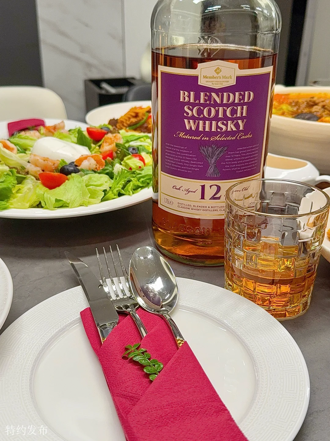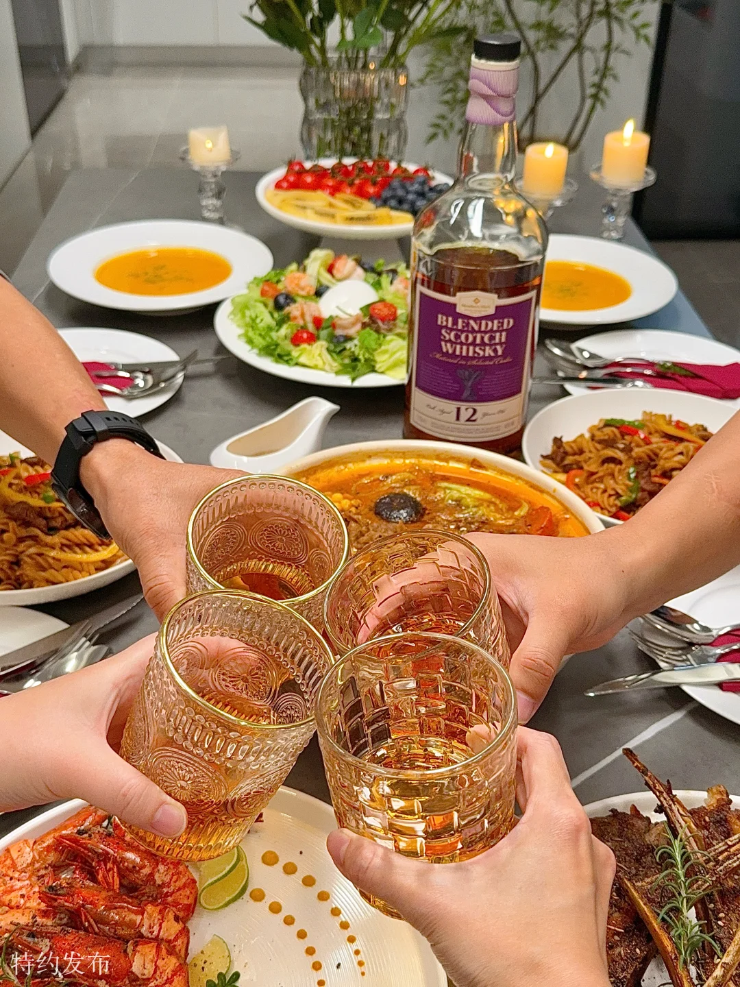 🥃今天搭配的是MM12年调和苏格兰威士忌了!金琥珀色的酒液,散发着淡淡的果香和辛香韵味。搭配整桌餐食,恰到好处地提升了整场聚会的格调。不胜酒力的姐妹也可以加冰块或者苏打水,小酌一口,微醺的氛围里,大家的谈笑都变得更放松、更尽兴了。