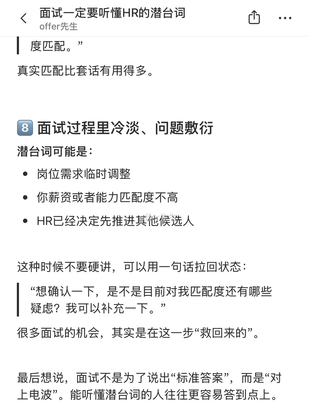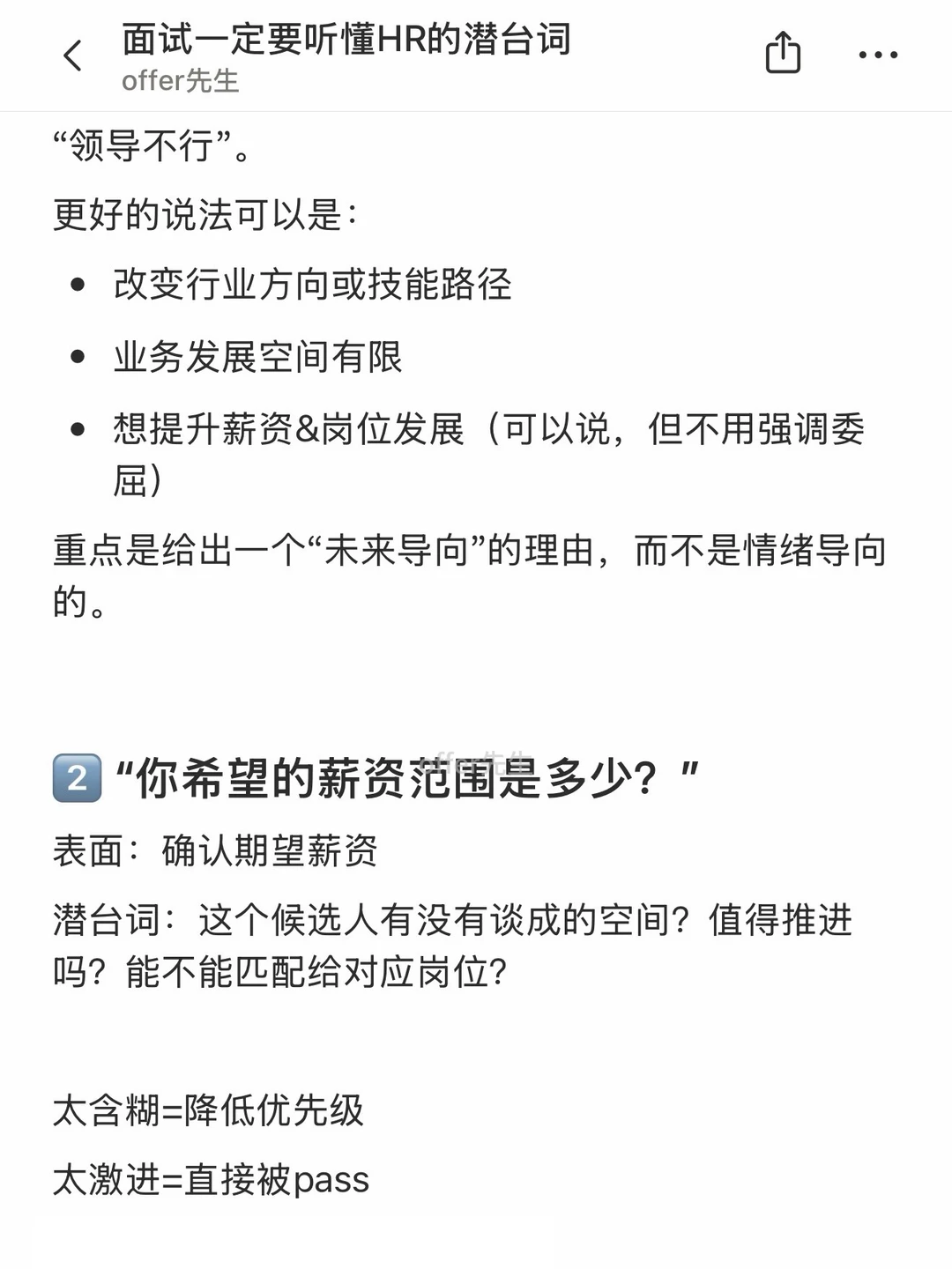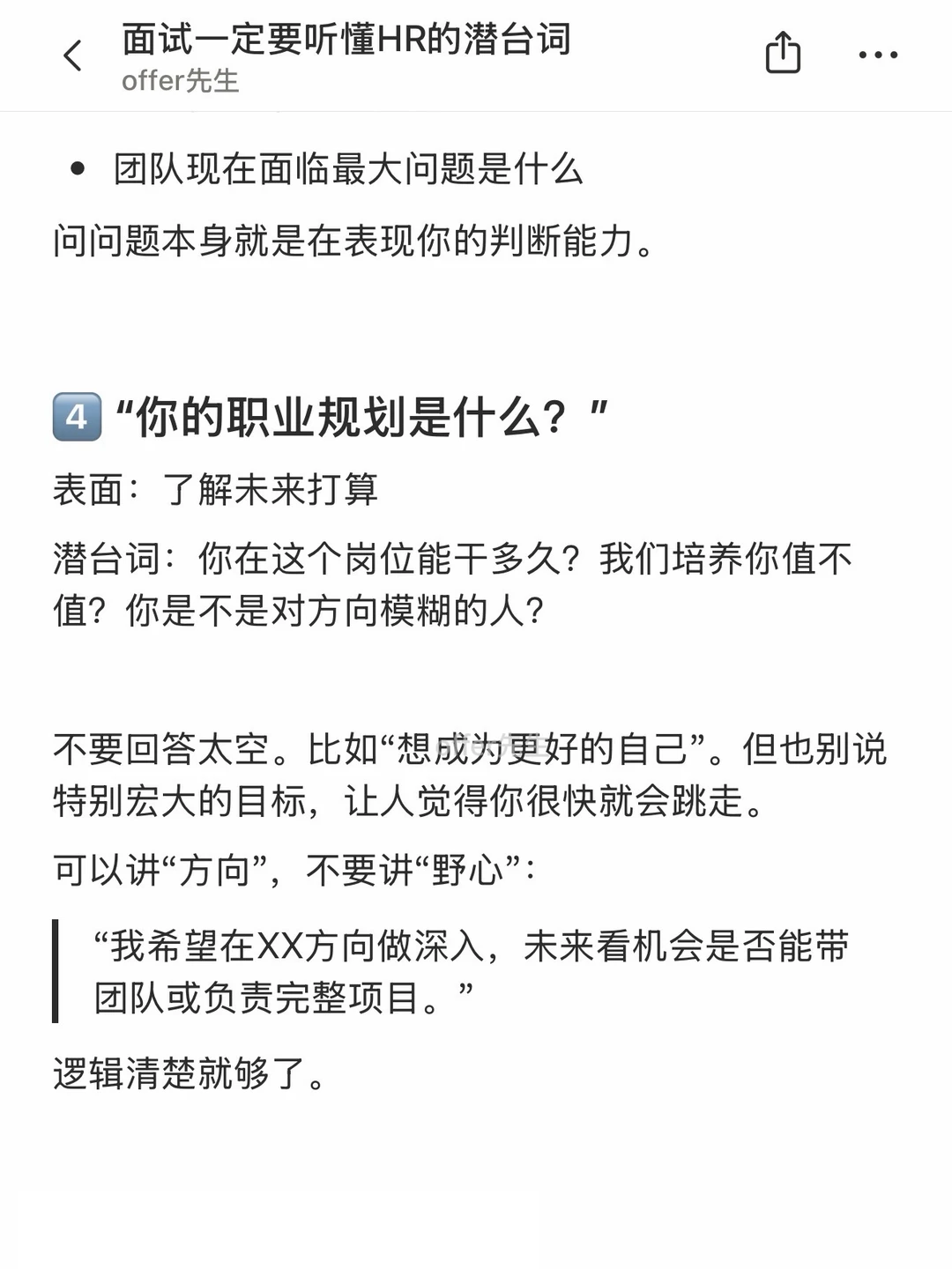 面试多了就会发现,HR很多提问其实都是“听起来像在问A,实际上想问B”。如果只按表面意思回答,很容易错失机会。 . 这篇将整理了几种面试中很常见、但容易误解的潜台词,顺便给到应对方法,方便大家现场拆招。 . 一个认真分享“找工作”干货的账号。真诚、有料、不说空话,只想用真实经历、具体方法,帮大家少走点弯路 .