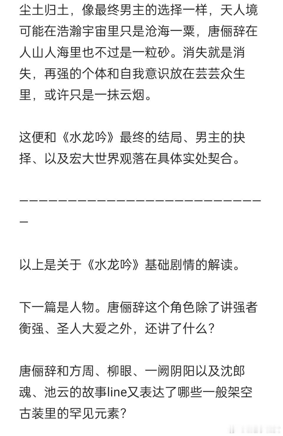 《水龙吟》完结安利repo第一篇。《水龙吟》属于看名字和分类题材很难联想到到底在讲什么的剧,而且架空古装容易让观众产生先入为主的错觉,所以repo的第一篇是写水龙吟世界观总览与男主唐俪辞的关系。爱好科幻/中式赛朋或者平时比较爱看漫画的朋友应该会更容易get到这部剧,关注我的读者们都知道,我每年精选可追的剧数量很少,并不是一个博爱主义者。再次推荐给喜欢新概念的观众朋友们,很开心内娱有这样优秀的编剧能改好藤萍的作品,也很开心有罗云熙这样的演员,会选择如此不走寻常路的创作。全长2900字左右。