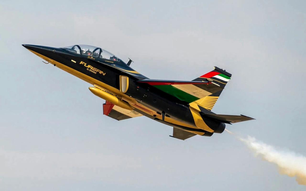 战机欣赏:分享一组阿联酋空军L-15高级教练机。该机主要装备其飞行表演队,金色的条纹涂装十分醒目。战斗机