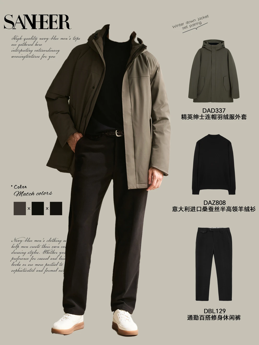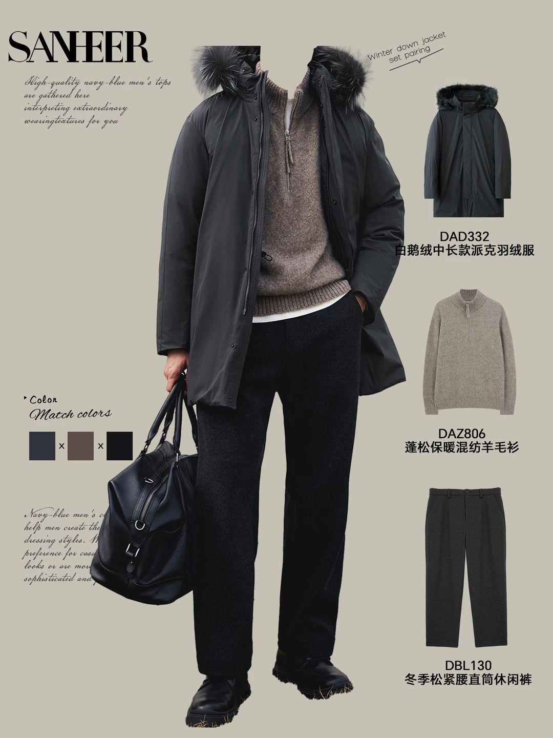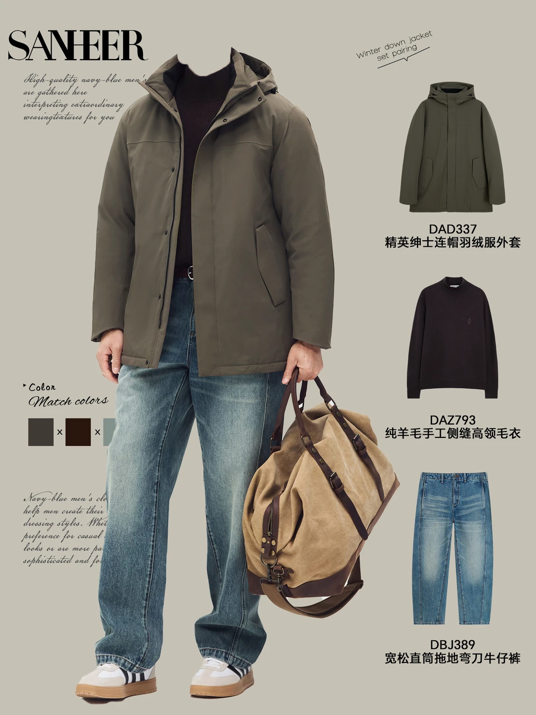 📸 秋冬男生怎么穿?SANHEER 连帽羽绒服给你 9 套高级感穿搭模板,从通勤到休闲,一键复制的时髦感,保暖还不臃肿! ✨ 【通勤精英风】 深色连帽羽绒服 + 质感毛衣 + 直筒裤 + 商务包像第一套的精英绅士廓形羽绒服,内搭羊毛花纹毛衣,下身配质感长裤,脚踩休闲鞋,拎上黑色公文包,上班穿利落又有格调,把 “职场型男” 焊在身上~ ✨ 【休闲松弛风】 军绿连帽羽绒服 + 纯色内搭 + 牛仔裤 / 休闲裤 + 复古包第四套军绿款太戳休闲感了!内搭纯羊毛高领毛衣,配宽位直筒牛仔裤和复古托特包,再踩双小白鞋,周末逛街、和朋友小聚都很自在,慵懒又不失品味~ ✨ 【冬日暖男风】 带毛领连帽羽绒服 + 柔暖针织衫 + 休闲裤 + 简约鞋第九套的带毛领羽绒服自带氛围感,内搭柔软羊绒衫,下身搭米白色休闲裤,脚踩小白鞋,一整个温柔暖男既视感,冬天穿这套约会,好感度直接拉满! 这些穿搭核心就是 **“叠穿层次 + 色调协调”**,用连帽羽绒服撑起冬日造型,不管什么风格都能轻松驾驭~男生们快码住,这个冬天告别单调,穿出高级感!