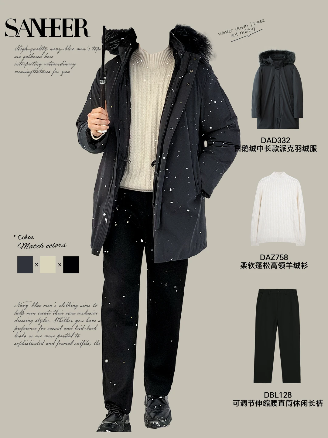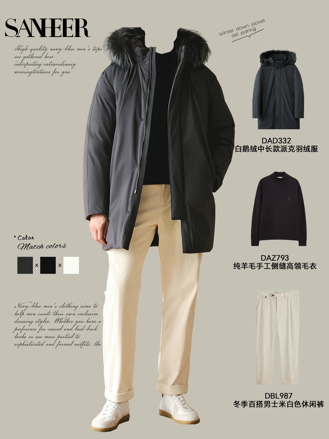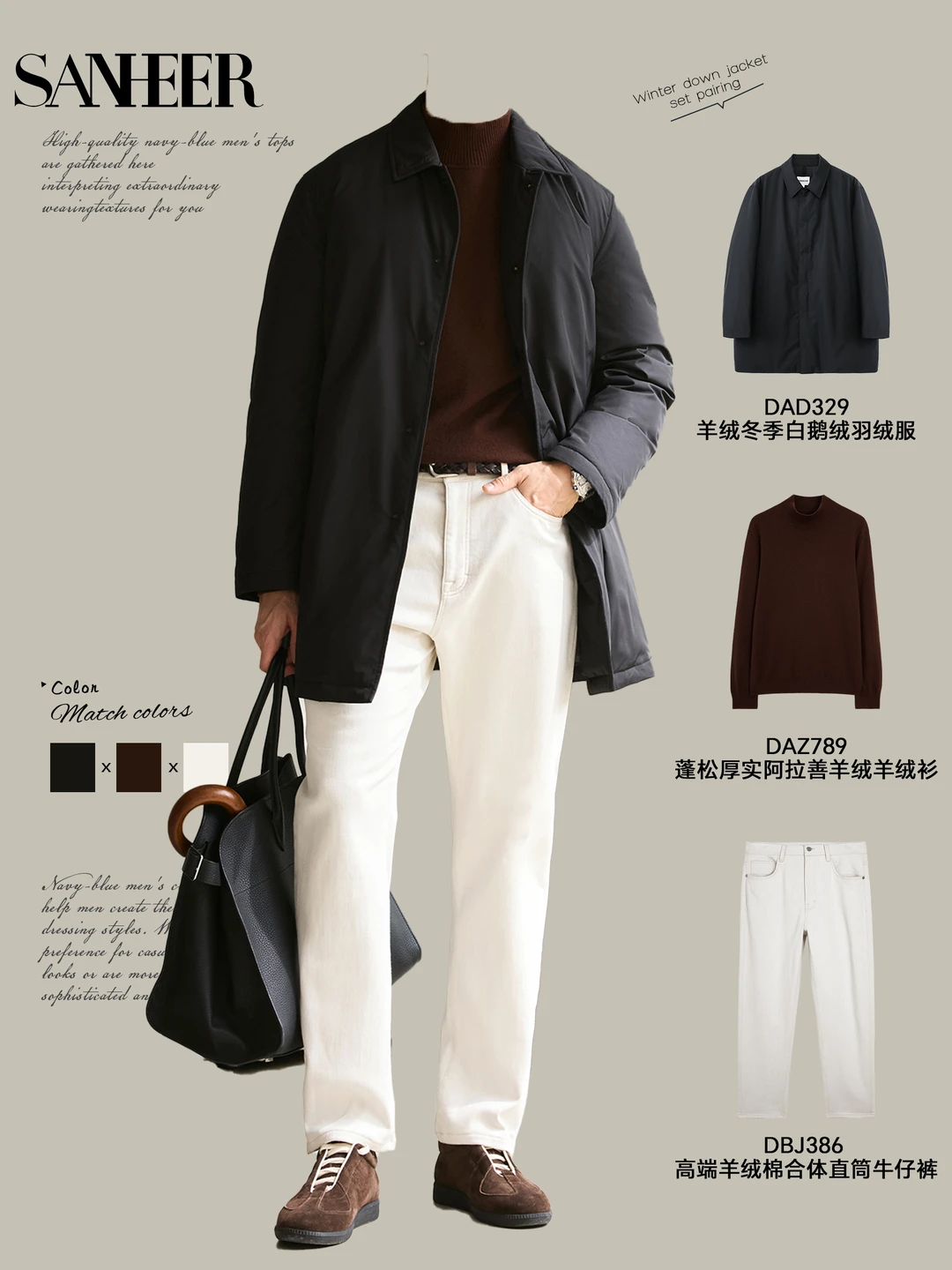 📸 秋冬男生怎么穿?SANHEER 连帽羽绒服给你 9 套高级感穿搭模板,从通勤到休闲,一键复制的时髦感,保暖还不臃肿! ✨ 【通勤精英风】 深色连帽羽绒服 + 质感毛衣 + 直筒裤 + 商务包像第一套的精英绅士廓形羽绒服,内搭羊毛花纹毛衣,下身配质感长裤,脚踩休闲鞋,拎上黑色公文包,上班穿利落又有格调,把 “职场型男” 焊在身上~ ✨ 【休闲松弛风】 军绿连帽羽绒服 + 纯色内搭 + 牛仔裤 / 休闲裤 + 复古包第四套军绿款太戳休闲感了!内搭纯羊毛高领毛衣,配宽位直筒牛仔裤和复古托特包,再踩双小白鞋,周末逛街、和朋友小聚都很自在,慵懒又不失品味~ ✨ 【冬日暖男风】 带毛领连帽羽绒服 + 柔暖针织衫 + 休闲裤 + 简约鞋第九套的带毛领羽绒服自带氛围感,内搭柔软羊绒衫,下身搭米白色休闲裤,脚踩小白鞋,一整个温柔暖男既视感,冬天穿这套约会,好感度直接拉满! 这些穿搭核心就是 **“叠穿层次 + 色调协调”**,用连帽羽绒服撑起冬日造型,不管什么风格都能轻松驾驭~男生们快码住,这个冬天告别单调,穿出高级感!